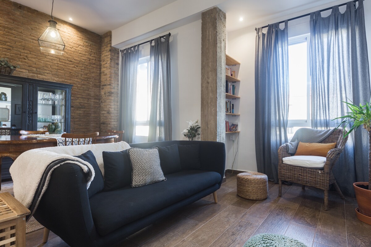 Loft located in the heart of the maritime district of Valencia, El Cabanyal, 5 min. from the Malvarosa beach. House built in 1900 and completely renovated without losing its essence. This stunning apartment fuses traditional architecture with chic boho design in a natural textured setting. Gaze at the high vaulted wood-beam ceilings and exposed brick walls as you dine in the marble kitchen area and cool off in the spacious rain shower.