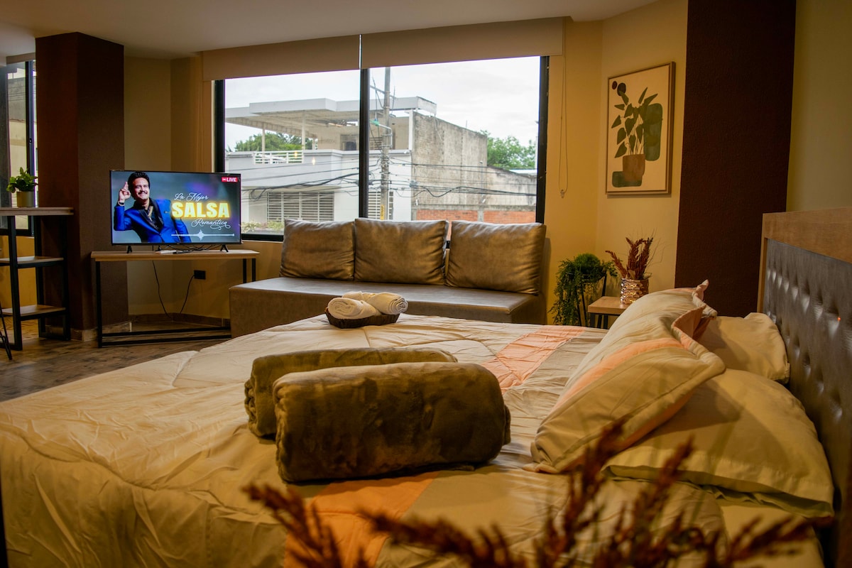 Disfruta de la belleza y modernidad de este alojamiento tranquilo y céntrico . Cuenta con: CAMA QUEEN, colchón semi ortopedico, AIRE ACONDICIONADO, smart TV, ZONA DE TRABAJO, INTERNET DE ALTA VELOCIDAD, clóset. Baño completo, DUCHA CON AGUA CALIENTE. COCINA completa y dotada. SOFACAMA Cercano a las Canchas Panamericanas, Estadio Pascual Guerrero, centros comerciales como Palmetto Plaza, Mallplaza, Cosmocentro y a las principales clínicas de la ciudad como Imbanaco y Farallones.