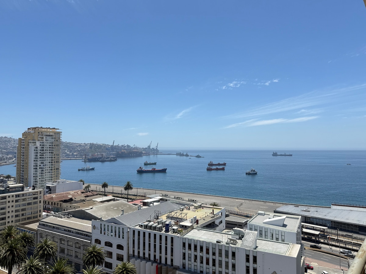Estiloso y amplio departamento de concepto abierto en cocina/comedor/living, ideal para poder compartir en familia o con amigos y disfrutar de la hermosa vista de la bahía. Esta ubicado en el corazón de la ciudad, a pasos Estación de Metro Puerto, Muelle Prat, Plaza Sotomayor, ascensor el peral, reloj Turri, perfecto para conocer caminando la ciudad y sus hermosos cerros. Vista privilegiada para ver los fuegos artificiales desde el balcón o dormitorio (piso 10) frente al puerto.