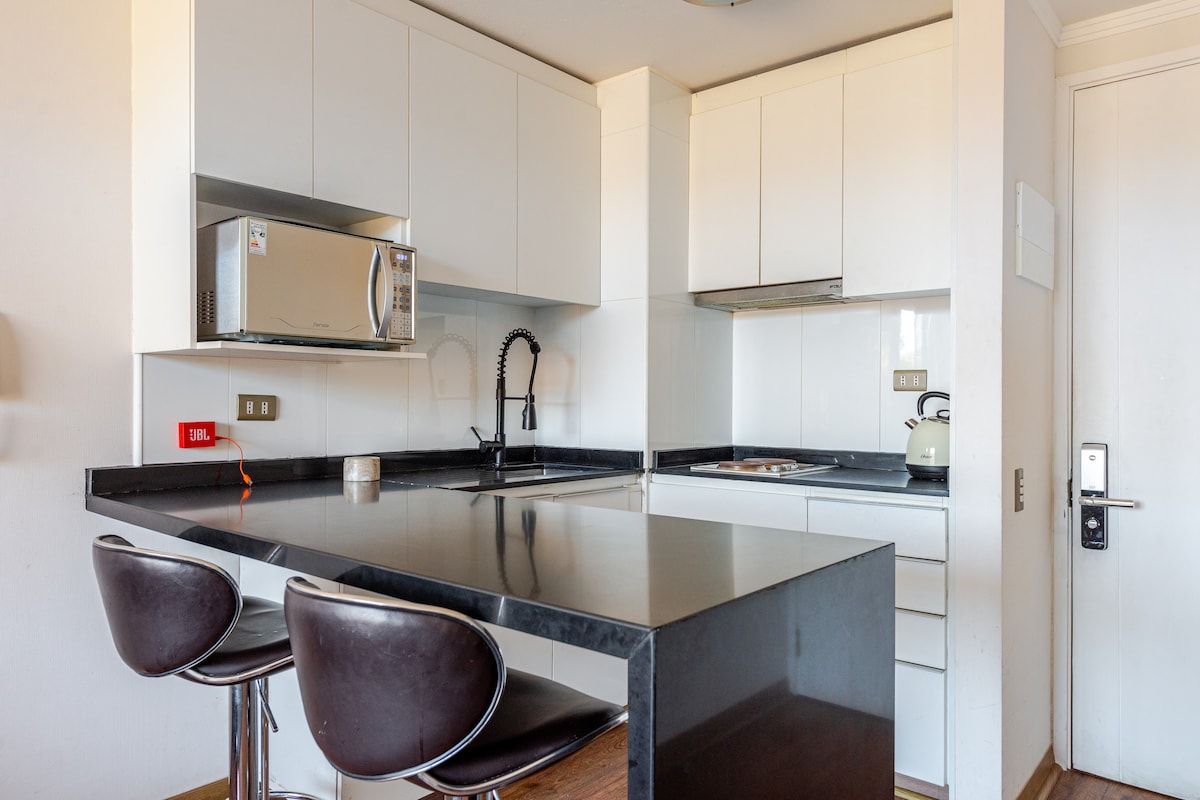 Descubre este departamento nuevo con vista al mar. Disfruta de la terraza, el baño amplio y piezas de diseño único de artistas chilenos que utilizan materiales reciclados. Además, estarás cerca de locales de comida rápida, una gasolinera y un supermercado. No te pierdas nuestras cortesías! estacionamiento gratis dentro del edificio y café de grano en nuestra máquina . ¡Ven y vive una experiencia inolvidable en Valpo! Calefacción en invierno tiene un costo adicional ,NO SE ACEPTAN VISITAS.