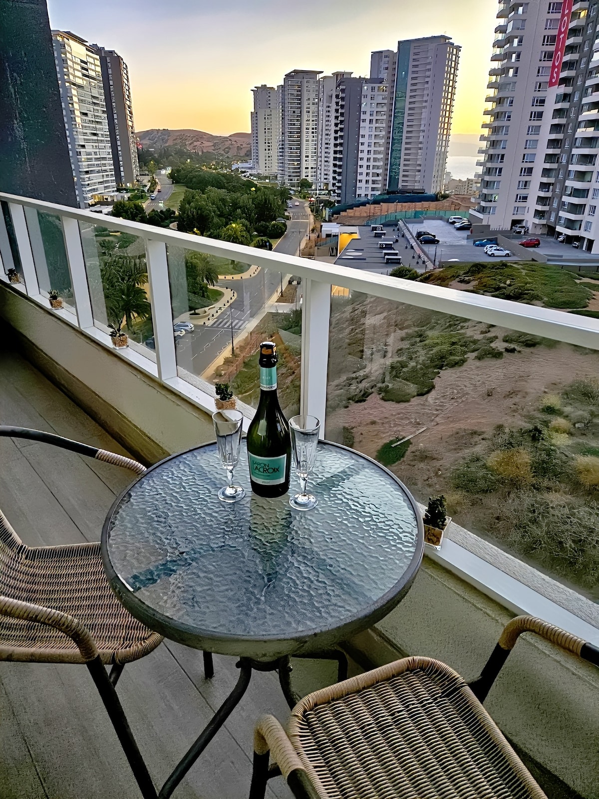 Lindo departamento con terraza vista al mar, un dormitorio un baño, completamente amoblado y equipado. Cuenta con wifi y cable para la tv smart de 42 pulgadas. Excelente iluminación. Edificio cuenta con consejería 24 hrs, 2 piscinas: exterior y temperada, gimnasio, sauna, quincho, lavandería y estacionamiento. Se encuentra cerca de supermercados, bencineras, farmacias. Ubicado a 5 minutos de la playa en auto, y 20 minutos a pie. Se ofrece descuento del 10% a estadías mayores a 7 días.