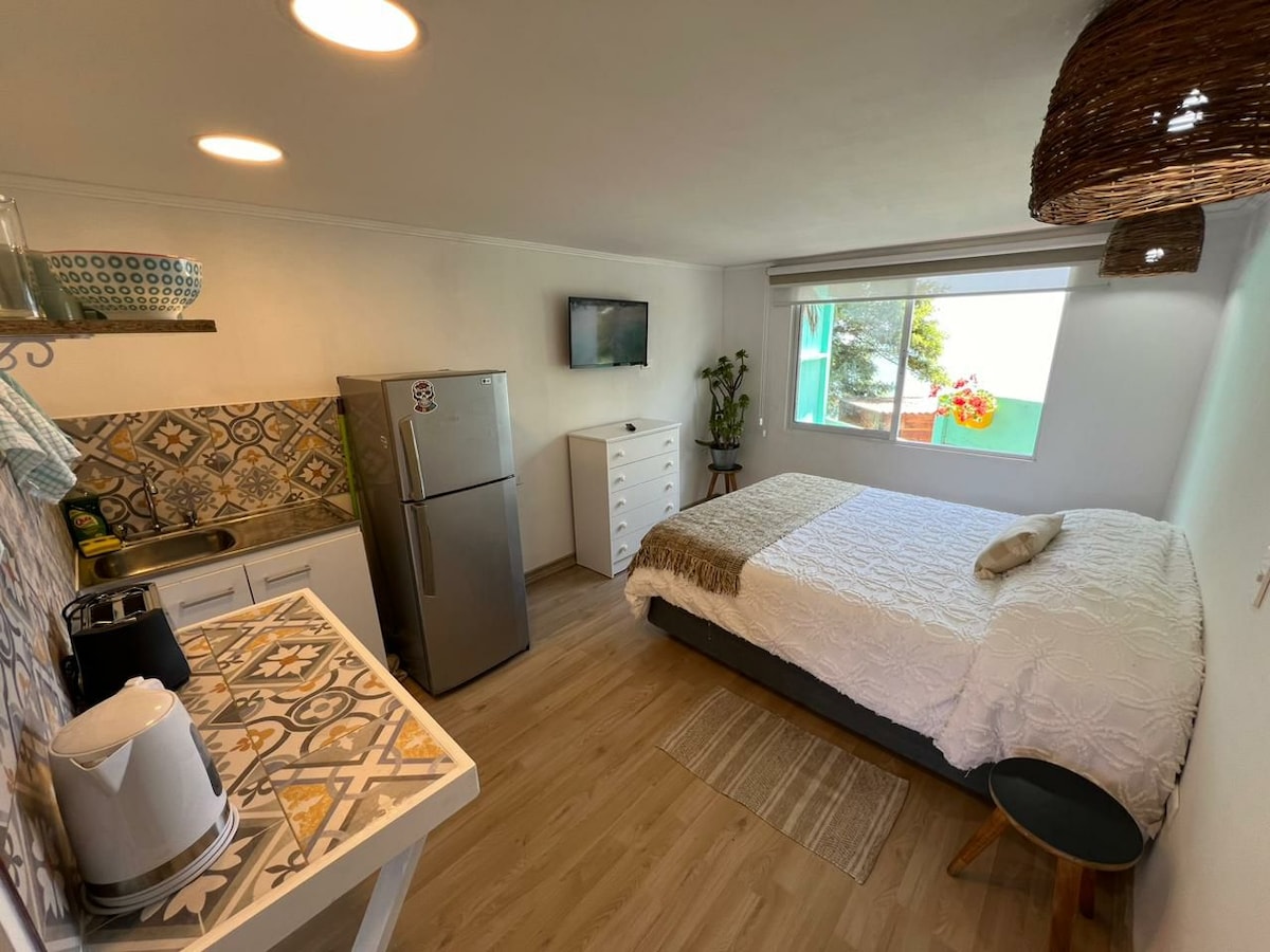 Lindo y cómodo departamento interior en casa familiar con entrada independiente. Ubicado en la comuna de las condes, uno de los sectores más seguros y tranquilos de Santiago. Cuenta con living-comedor, cocina equipada, baño privado en suite, cama de 2 plazas . Se encuentra a poca distancia de supermercados, centros comerciales, restaurantes, cafés, farmacias y clínicas.