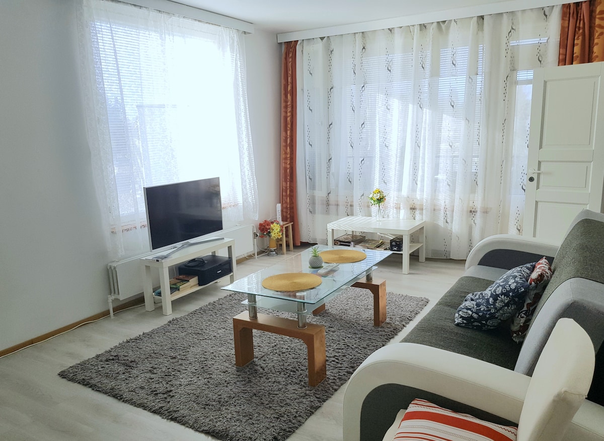 Tästä sijainniltaan keskeisestä kohteesta koko ryhmälläsi on hyvät kulkuyhteydet kaikkiin tärkeisiin paikkoihin. Juna-asema ja kauppakeskus on parin minuutin kävely. Avara ja valoisa täysin varusteltu asunto. Asunnossa majoittuu mukavasti 6 henkilöä. Makuuhuoneessa on 160cm ja 80cm sänky. Olohuoneessa on 2 erillistä 80cm sänkyä sekä vuodesohva levitettynä 120cm. Pimentävät verhot takaavat hyvät yöunet. Etätyöpiste ja pesutorni asunnossa. Lähettyvillä paljon puistoalueita. Ilmainen autopaikka.