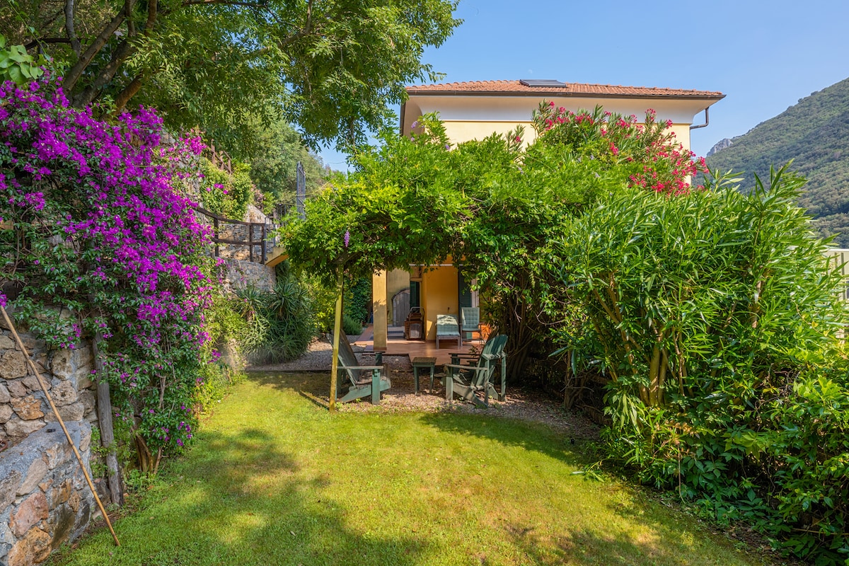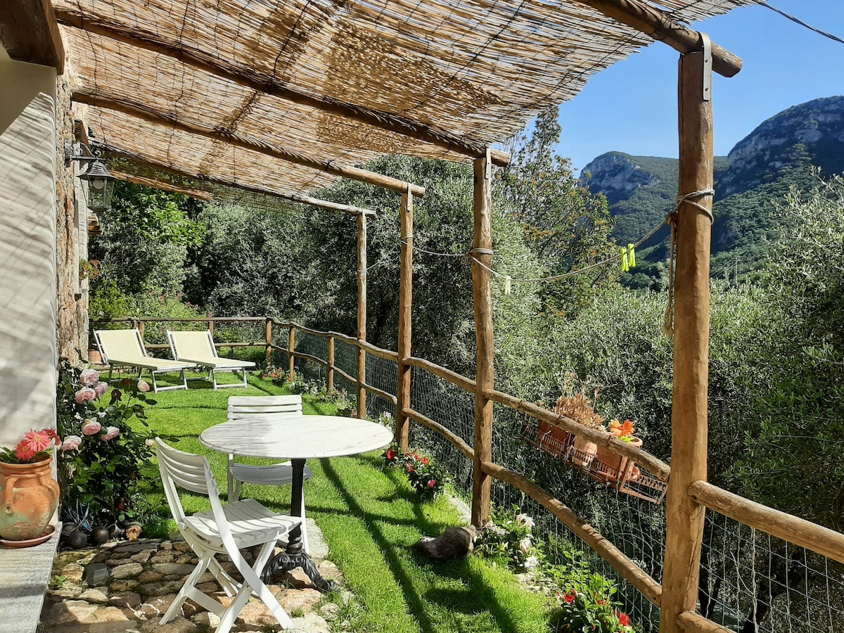 Una tipica casa ligure sulla prima collina, affacciata sul mare, circondata da un grande giardino terrazzato con ulivi e alberi da frutto. Un'oasi di pace a 5 minuti a piedi dalle spiagge e dal paese. L'ingresso, indipendente, avviene dal giardino. L'appartamento appena ristrutturato si compone di un soggiorno con angolo cucina e zona pranzo e, separati, due divani letto singoli. Da un disimpegno si accede al bagno con doccia e alla camera con letto matrimoniale ed accesso diretto al giardino