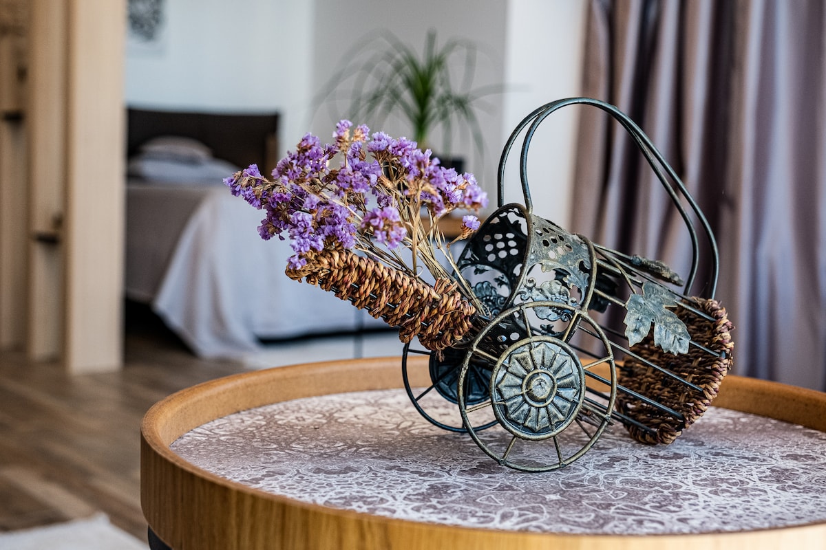 Modern 1-bedroom apartment in the prestigious Carpe Vita complex in St. Constantine and Helena. Designer interior, peaceful garden setting, several pools, and private parking. Features sofa bed, washer/dryer, fully equipped kitchen, cable TV & fast Wi-Fi. Just minutes from the beach, mineral pools, and nature.