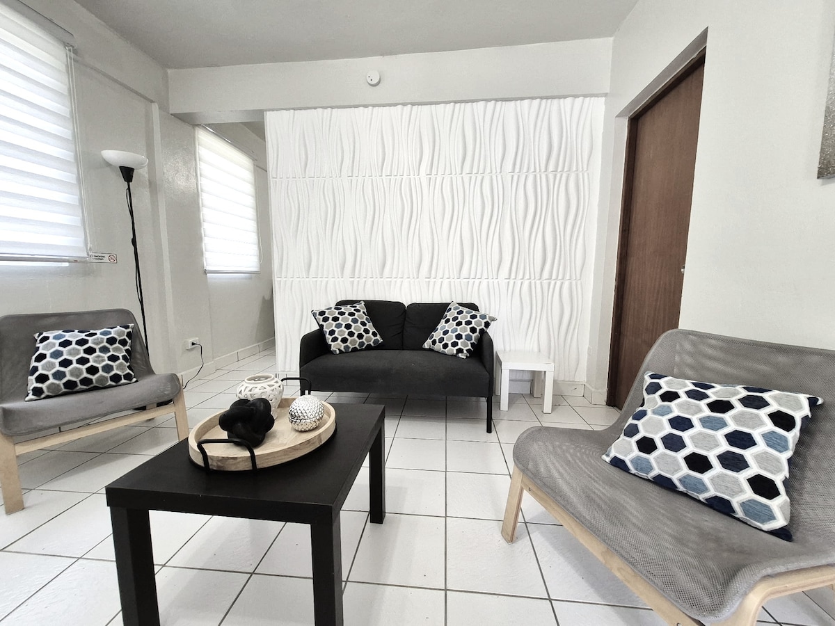 The Sands suite is located on our first floor, short walk to the Caribbean Ocean. The property have a rooftop which is a unique place to fraternize enjoy coffee, spirits, or the sunsets with a warm Caribbean breeze. We will provide a curated list of our favorite local restaurants and places to visit. Kick back and relax, it is calm, stylish and fun! We are 5 mints away from the Puerto Nuevo Beach, a blue flag beach, while the ocean is just at a few steps from our home apartment, enjoy!