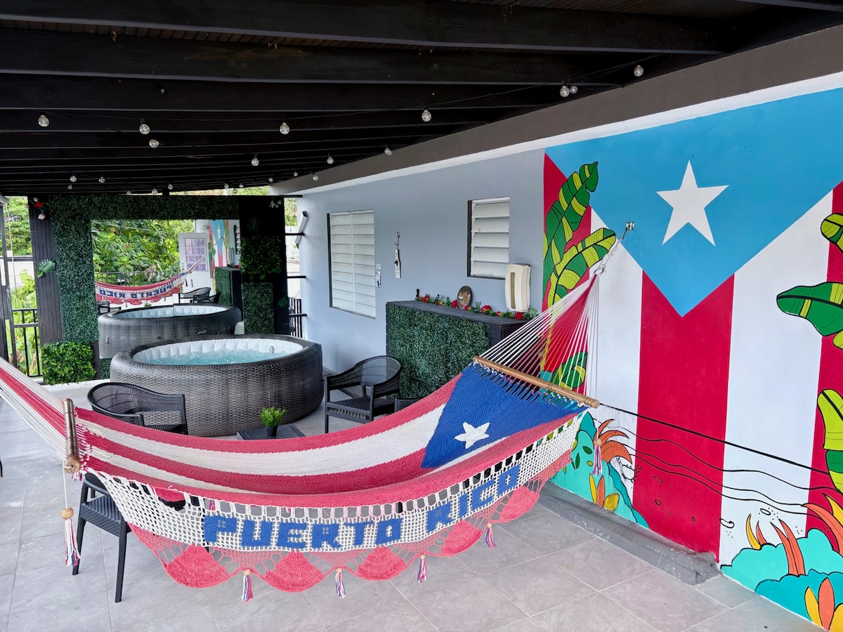 The house features 2 bedrooms with a queen bed and a full/full bunk bed, a spacious living room, a fully equipped kitchen, dining area, balcony, parking, laundry, Wi-Fi, and a spectacular terrace with a jacuzzi. It is conveniently located near Acropolis of Manatí, Tortuguero in Vega Baja, and Morovis. It is the perfect place for a romantic getaway or to enjoy quality time with family and friends. Nearby attractions include Playa Puerto Nuevo, Mar Chiquita, Los Tubos, and La Esperanza Beach.