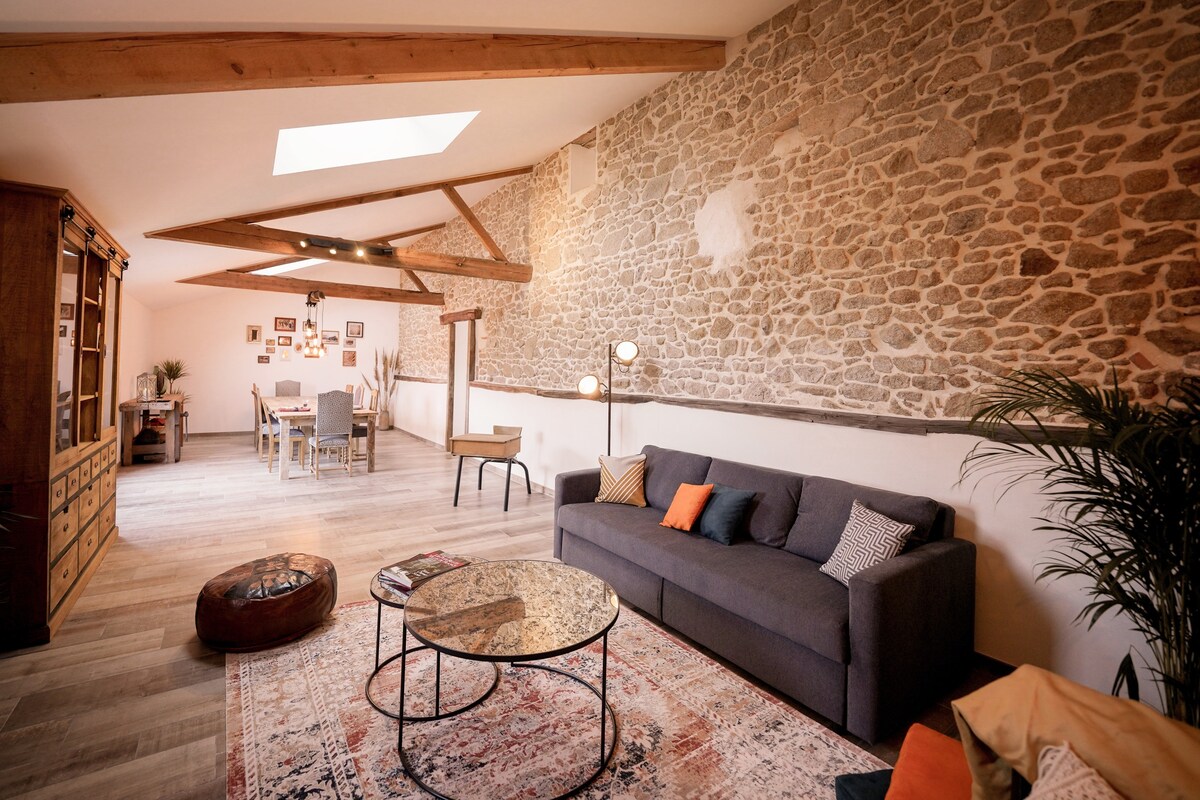 Au pied d'un grand pin aux abords de la Sèvre nantaise vous disposerez d'un grand logement (127 m2) dans un ancien bâtiment industriel entièrement rénové avec une vue imprenable sur la campagne. Au départ du gite, vous pourrez partir en randonnée sur les bords de Sèvre jusqu'au château de Barbe Bleue puis vous prélasser sur la terrasse en regardant le couché de soleil. Au coeur du bocage proche du Puy du Fou vous pourrez aussi profiter des activités touristiques du Choletais.