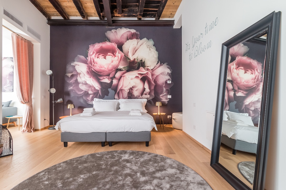 BLOOMS, Botanical Rooms, the boutique hotel in the heart of the historic center of Padua, along Via del Liston where you can find the best boutiques and restaurants in the city. Just a stone's throw from the main squares of the city and the historic Caffè Pedrocchi, located in a strategic position 1km from the train station and 900m from Prato della Valle and the Botanical Garden, 5min from the tram stop.
