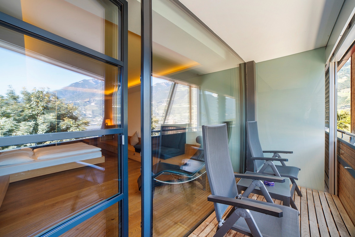 Room Pazeider Panorama Suite 405 in Marlengo provides 45 sqm of space for up to 2 guests. You have 1 bedroom and 1 bathroom during your stay. The room is located on the top floor of Hotel Pazeider and features step-free access with elevator access. Your private amenities include a balcony with mountain view offering a 180-degree panoramic view of Meran and the South Tyrolean mountains, air conditioning, TV, WiFi, baby bed, dedicated workspace, and breakfast included.