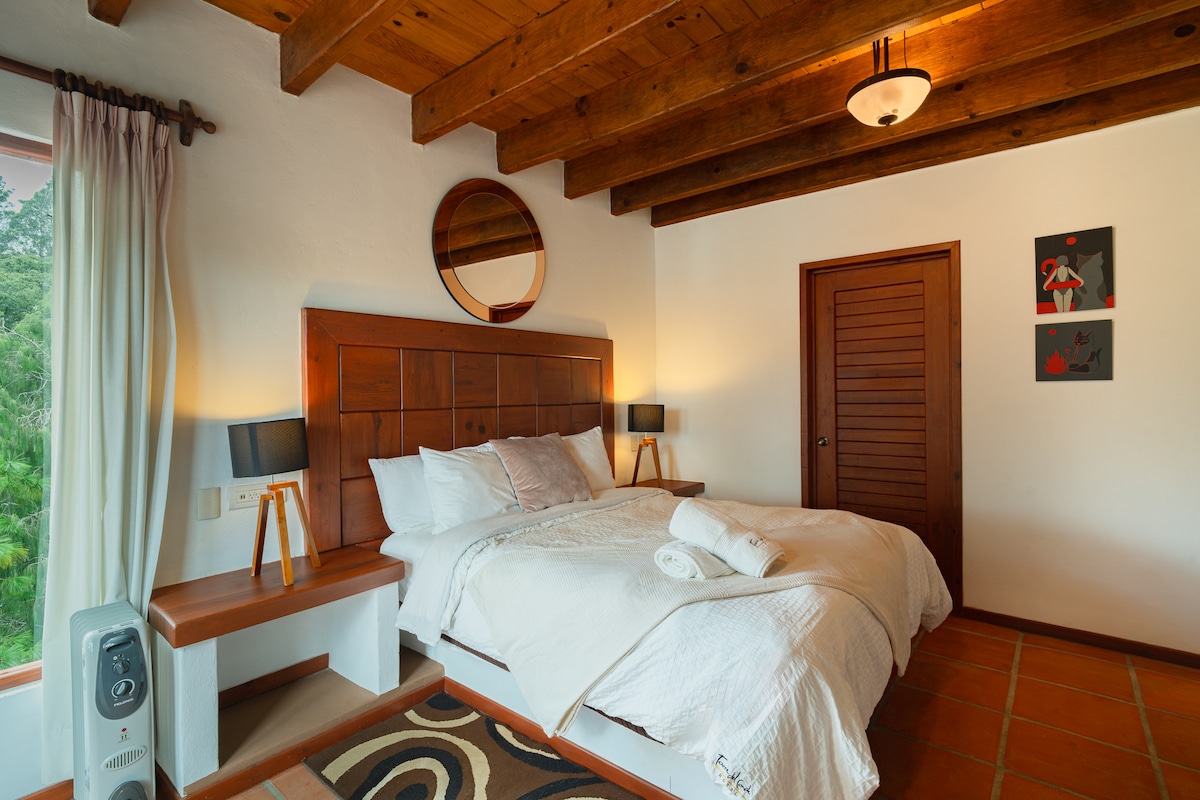 En el centro de Coatepec, 5 min. caminando al parque y la parroquia de San Jerónimo. Es una habitación en planta baja de cómodo acceso, con vista al jardín, su gran ventanal ilumina toda la habitación lujosamente amueblada y muy espaciosa, para que nuestros huéspedes se sientan como en casa.