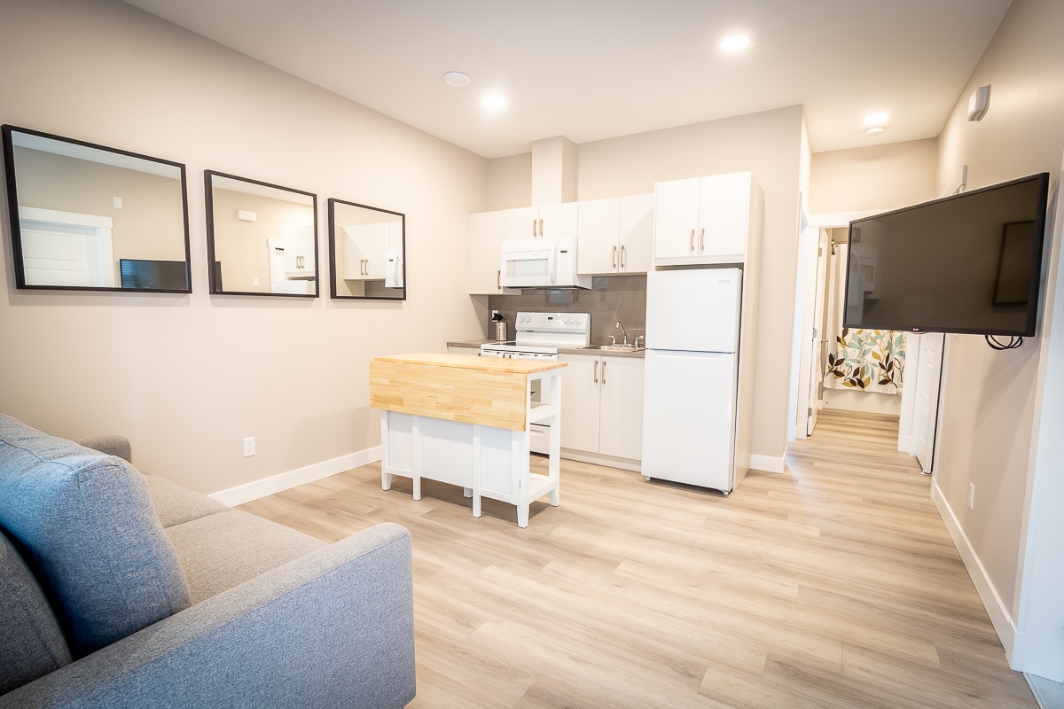 Modern ground level daylight basement suite with fully stocked large kitchen. A/C for the summer, furnace for the winter with electric fireplace, and additional heaters in each bedroom to make sure you are always comfortable. Well lit space with cellular blinds. USB port on each lamp for convenience. Fast 100 mbps internet and smart tv with cable access or streaming services. Kitchen has full sized appliances, water filter system, and an ice maker in the fridge.