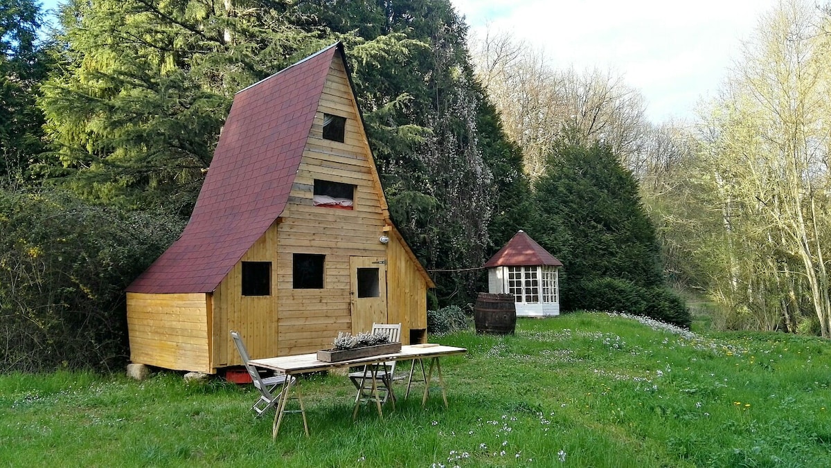 Venez profiter d'une cabane atypique de 25 m² au cœur de la nature. J'ai construit ce petit cocon au calme pouvant accueillir de une à trois personnes ( un lit 140 et un canapé convertible). Vous pourrez profiter de la grande terrasse en bois et de ses magnifiques coucher de soleil. Notre philosophie au cœur de la nature et en adéquation avec celle-ci a nécessité l'installation de toilettes sèches ( externe et accolés au logement). Le bain nordique est privatif et en option.