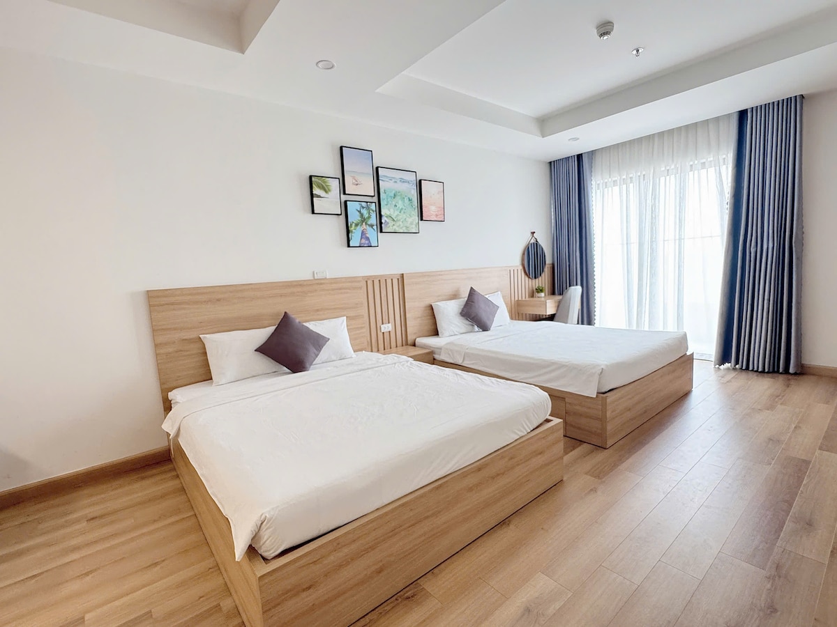 Welcome to our unique oceanfront corner suite right across My Khe beach. It is meticulously designed with a coastal theme and equipped with high-end furnishing. With 80 square meters of elegantly designed living space, our beach home promises a truly unforgettable stay. Important Notice: Our property is situated right at the central beach, directly across from where holiday events take place. Additionally, there's a bar nearby that plays music at night.