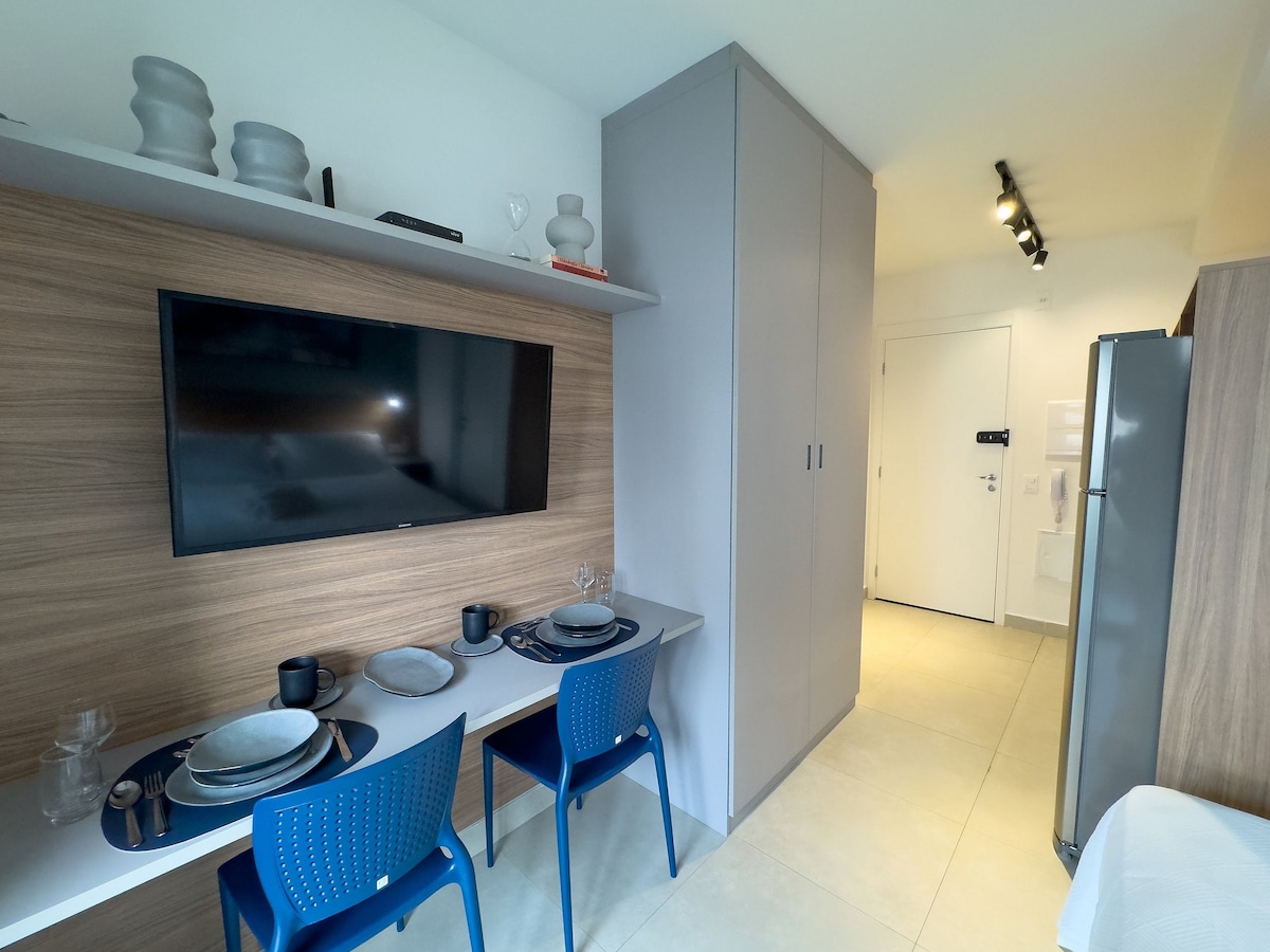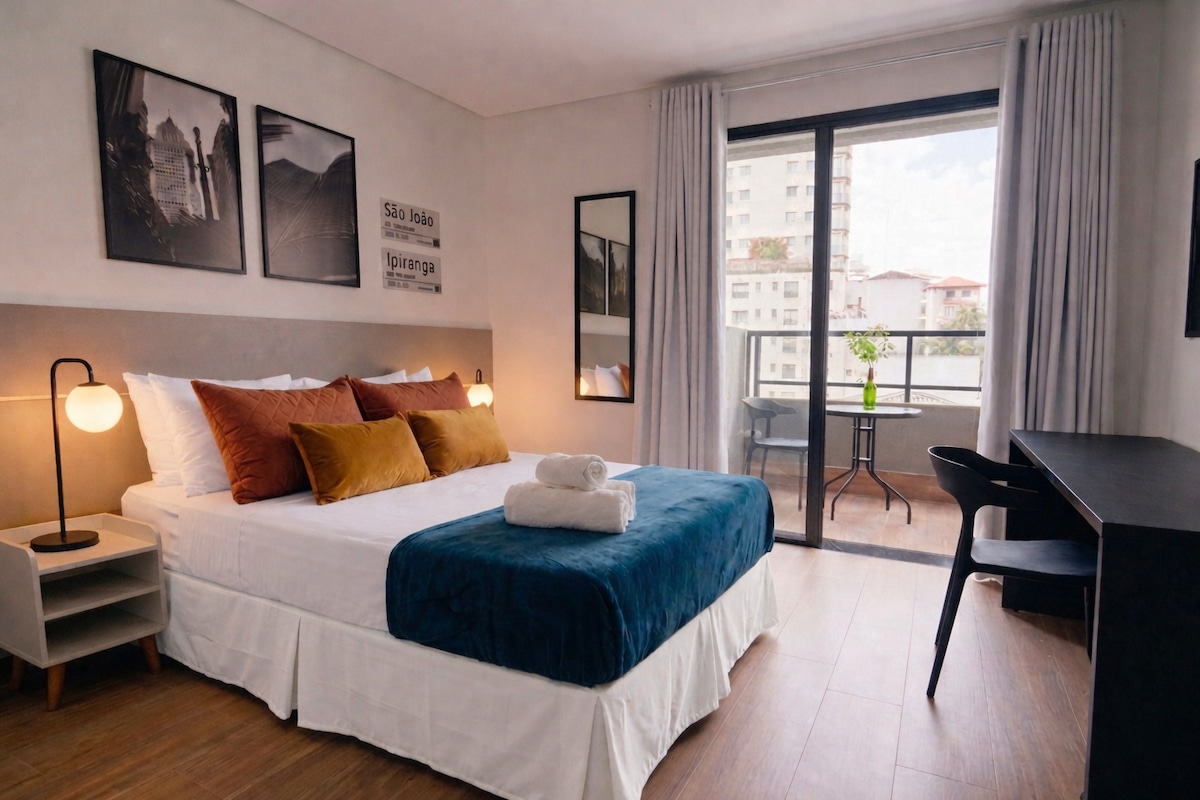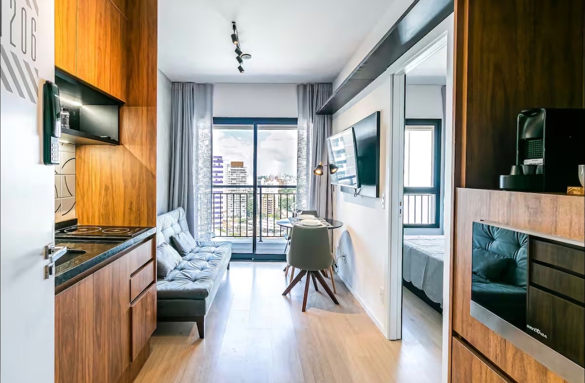 Modern and fully equipped studio in a new building with a spacious balcony, gym, coworking space with meeting room, OMO laundry, and a Market4You convenience store. West Side Vila Madalena is located on the charming Rua Harmonia, in one of São Paulo’s most vibrant neighborhoods. Just a few minutes’ walk from Vila Madalena subway station and surrounded by cafés, bars, restaurants, art galleries, and boutique shops. With fast Wi-Fi, Smart TV, and a fully equipped kitchen.