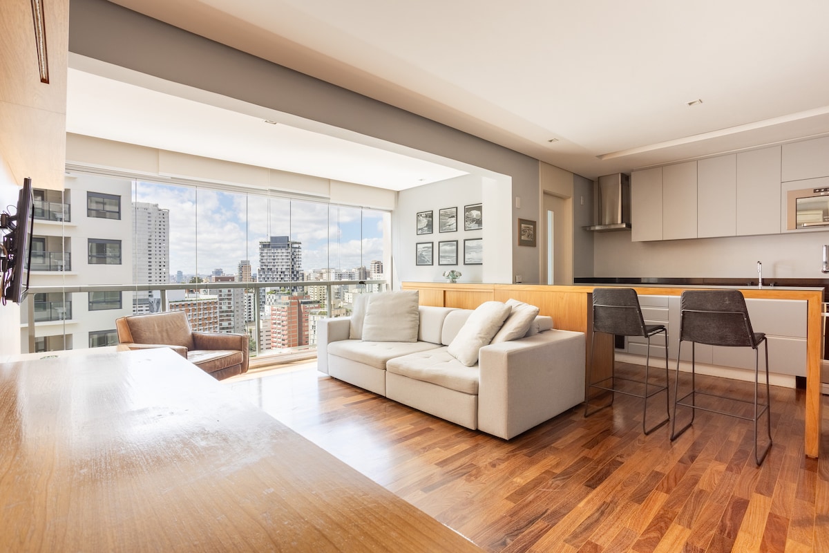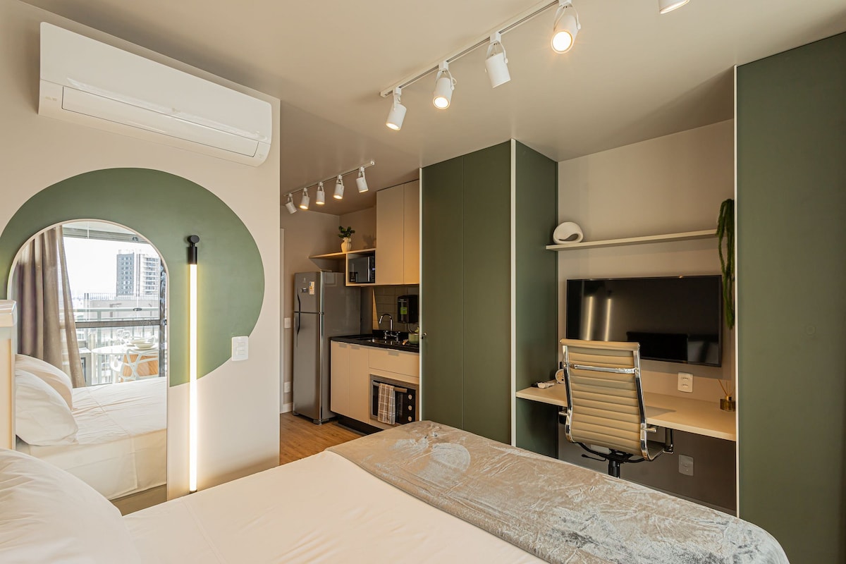 A 300 do metrô V. Madalena, perto de restaurantes, lojas, bares e espaços culturais. Cama de casal super confortável, A/C, internet, SmarTV 42", bancada grande para trabalho, mesa para refeições, decoração estilosa, janelas retráteis com muita luz natural e vista da cidade. Cozinha compacta conta com mini refrigerador, cooktop elétrico de duas bocas, filtro de água, sanduicheira e liquidificador e utensílios de louça. Piscina climatizada, academia, lavanderia e mini-loja de conveniência.
