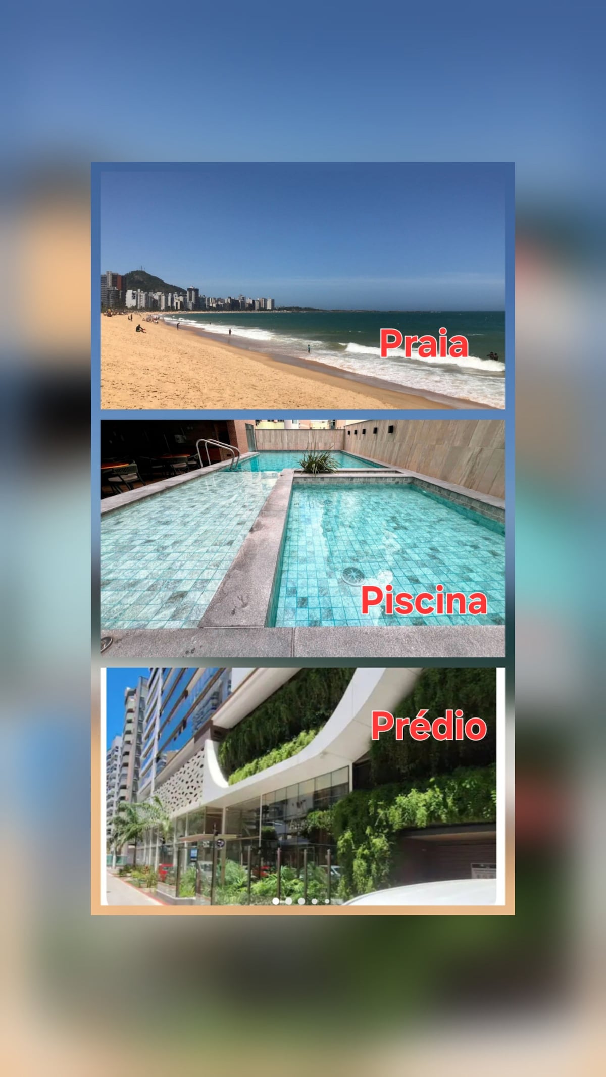 O prédio conta com porteiro 24 horas, piscina (não nos responsabilizamos por eventuais manutenções ), 3 elevadores, restaurante (pago), salão de beleza (pago). O apartamento possui uma linda vista para o mar, bem iluminado e arejado, muito aconchegante e próximo a tudo. Possui fogão, geladeira, microondas, ar-condicionado, smart Tv na sala. Ferro de passar, secador de cabelo. Uma vaga de garagem(espaçosa) . :