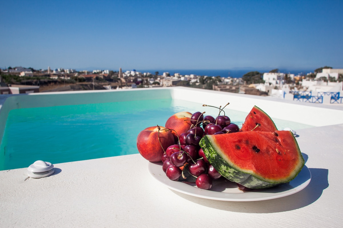The Premium Spa suite offering uninterrupted views of the Volcano, Caldera and the sea. Each suite is a private modern spa. They all feature a private hamam, hydro massage and aroma therapy in the bathroom while the suites come with a private heated plunge pool at the outdoor veranda with caldera views. Plenty of services are available, daily room service with choices of breakfast served privately in your suite and spa massage treatments upon request