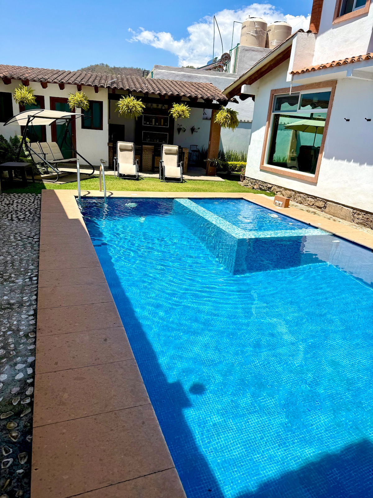 Hermosa casa, moderna y campirana con cuatro recámaras, alberca con jacuzzi y con calefacción de caldera de gas (opcional), área social junto a la alberca con asador, tarja, cantina y barra, amplio jardín, estacionamiento, ropa de cama y toallas incluídos, cocina equipada con todo lo necesario (insumos no incluídos) , Wifi, chimenea, pantalla con cable en sala y recámara principal para una linda estancia confortable y placentera.