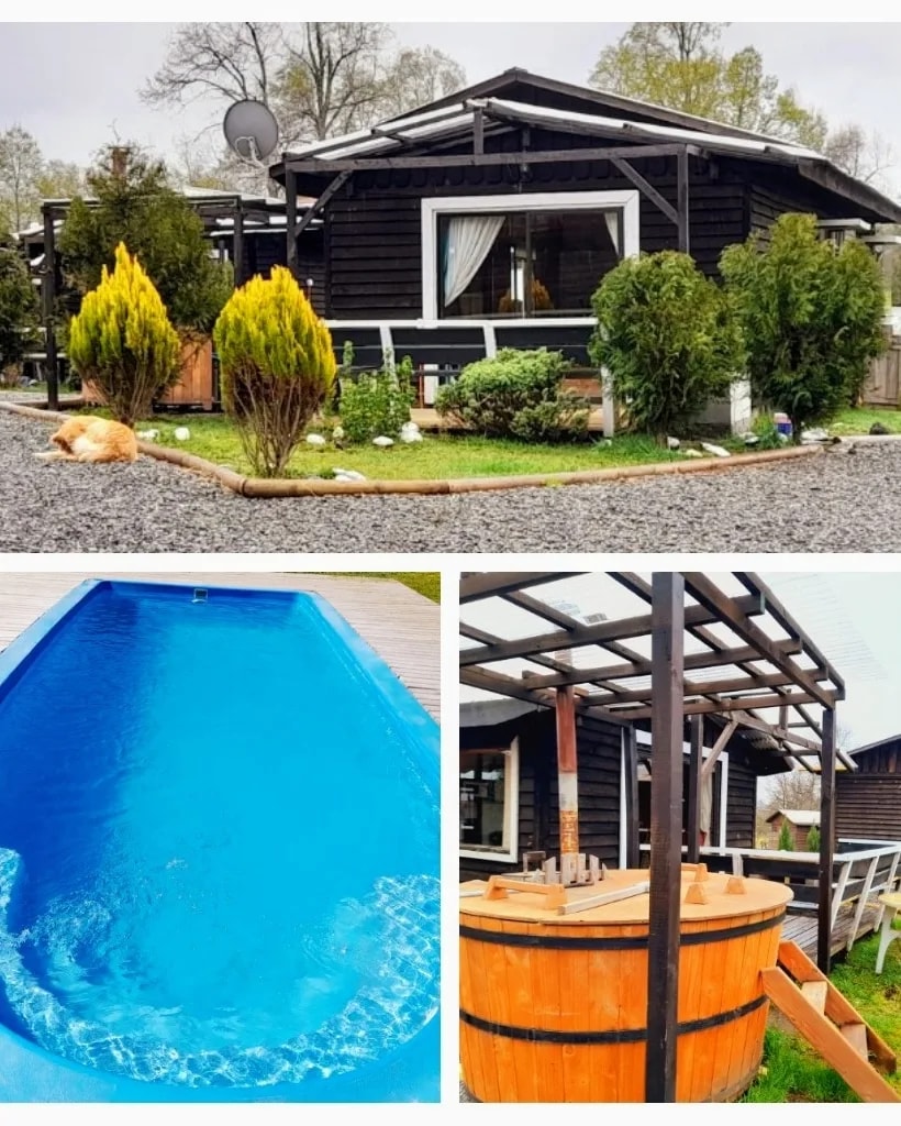 Cabaña ubicada en un campo en el Km 6 aprox de la ruta Vllca-Pucón, equipada para 4 huéspedes con sábanas, toallas, cocina con microondas, hervidor, refrigerador. Con combustión lenta, estufa eléctrica y calientacamas. Tv satelital Direct Tv. Tarifa incluye 1/2 saco de leña por estadía del 1 de mayo al 30 de agosto. Hot tubs en los jardines del recinto con costo extra de $45.000 por 4 horas de uso. Se debe coordinar con un día de anticipación la reserva del Hot Tubs para su preparación.
