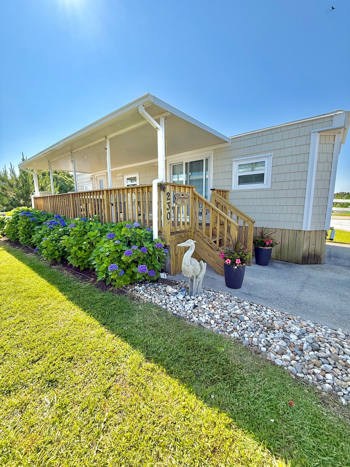 **Newly RENOVATED for 2025**. Trident Cottage is a 2 bedroom 1 bath mobile home situated on a waterfront lot on Back Bay….the beach is a quick 5 minute walk across the street. We include at no extra charge, everything needed for a vacation at the beach! All linens, Beach towels, beach cart, chairs, tent and cooler. Just bring your swim suit and flip flops! I provide you with 2 beach cruiser bikes at no extra charge. Resort amenities are available for your use.