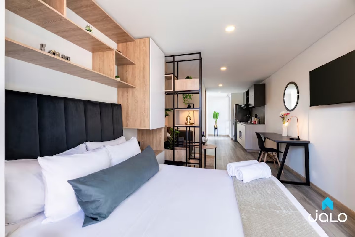Located in the best area of Bogotá. ideal for business trips, leisure and small families that want to stay in a studio apartment. You will be in walking distance from three main shopping centers, top restaurants, gyms, supermarkets, bars, clubs, parks, coffe shops, hospitals and public trasnport stations in the city. This brand new studio apartament offers 24/7 doorman security a panoramic terrace on the building´s top floor, jacuzzi and front view to one of Bogota´s principal parks, el Virrey