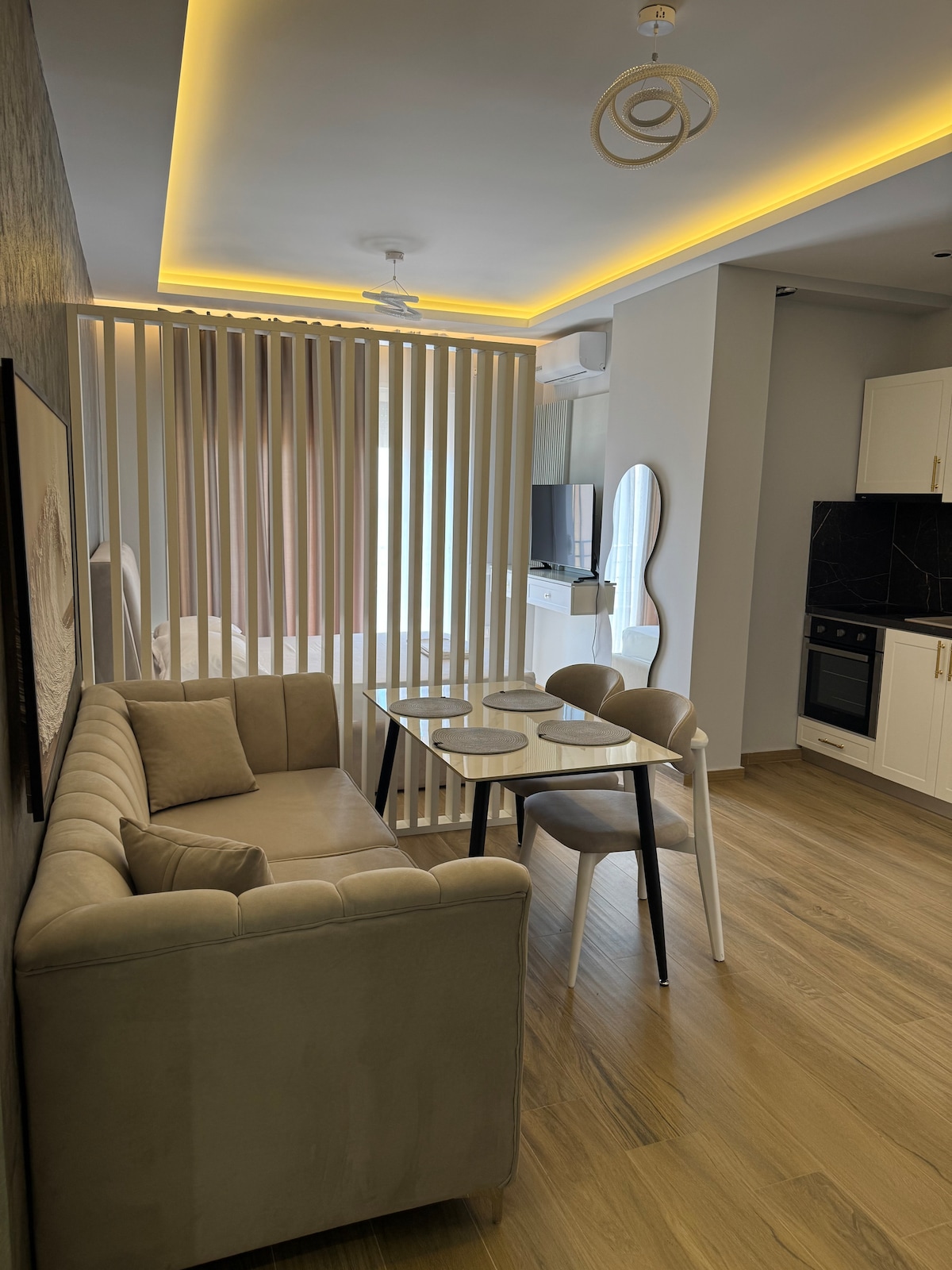 Make yourself at home in our warm apartment. Enjoy the stunning sea view from the large balcony adorned of natural flowers. Our place is new and has a contemporary feel while still inviting. Includes a convenient kitchen, a master bedroom, a comfortable sofa in a open plan living area and the elegant shower designed with care. Suitable for remote workers. Located in the most attractive area of the city, right on the seafront, our place is ideal for your visit and stay in Vlore.