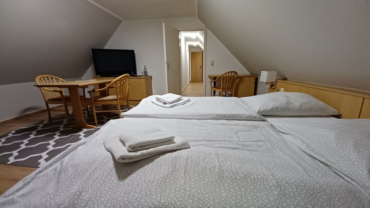 Das Zimmer ist ausgestattet mit 1 Einzelbett, 1 Doppelstockbett und einem 1,60 m Boxspringbett in 2 getrennten Schlafräumen. Ebenso mit einem eigenem Duschbad. Im Erdgeschoss befindet sich ein Gastraum mit Gemeinschaftsküche. Direkt gegenüber vom Ferienhof befindet sich eine Bushaltestelle sowie ein großer Spielplatz mit Tischtennisplatten, Fußballplatz, Basketballplatz und mehr.