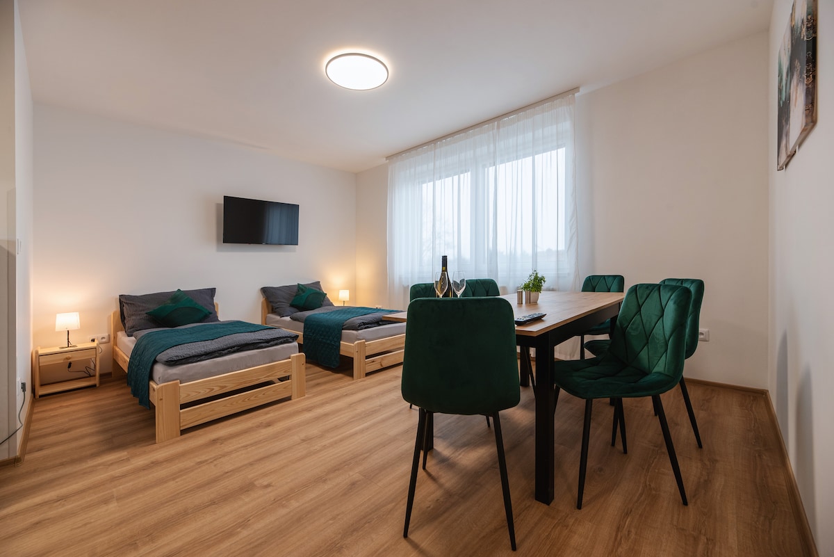 Privátní ubytování v moderním apartmánu o celkové ploše 150 m2, s kapacitou až 8 osob, soukromým spa a kinosálem (včetně vybaveného baru) a parkováním. Je ideální variantou jak pro uzavřenou skupinu či rodinu toužící po soukromí, klidu a odpočinku, ale i zábavě v případě nepříznivého počasí, tak pro uspořádání soukromé narozeninové oslavy, rozlučky se svobodou, nebo dámské či pánské jízdy.