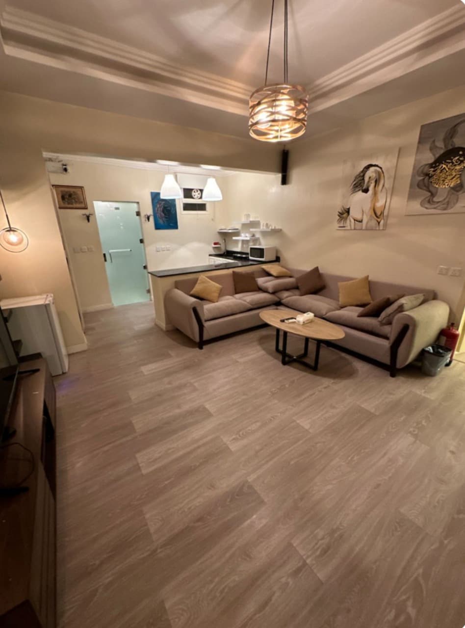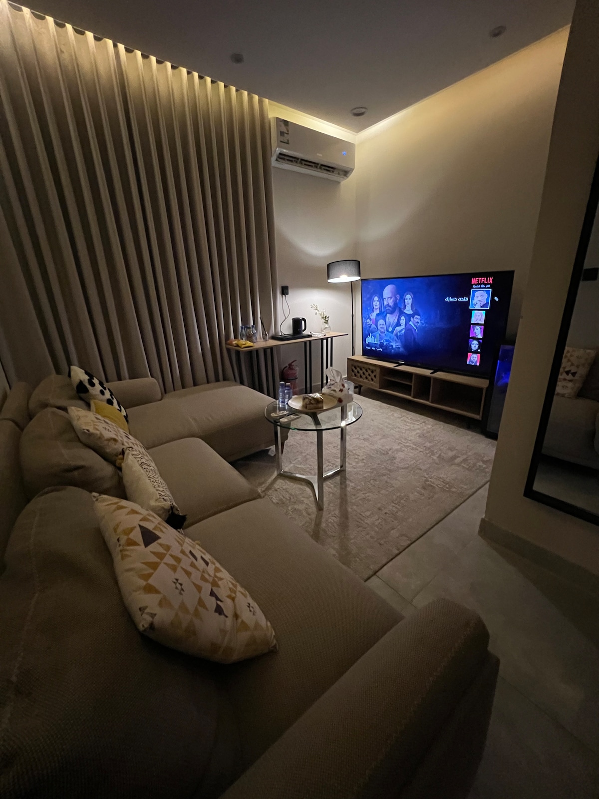 استرخ في هذا المسكن الهادئ والأنيق. بشاشة عرض 70 بوصه ومطبخ مجهز وادوات فندقيه متكامله في شارع مكتمل الخدمات .