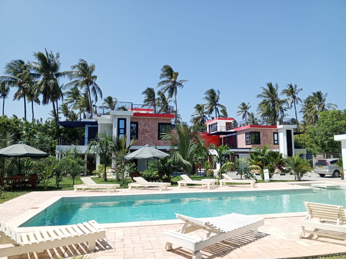 Escape to the breathtaking shores of Malindi, where sparkling golden sands and azure waters meet in perfect harmony. This magnificent beach house will fascinate you. Enjoy the peace and the sound of crashing waves. Fall asleep to the lullaby of ocean waves. Wake up rested and ready to enjoy the day. Step out your door onto a pristine beach, surrounded by lush palm trees, or unwind by two sparkling swimming pools. Best place to rest and relax