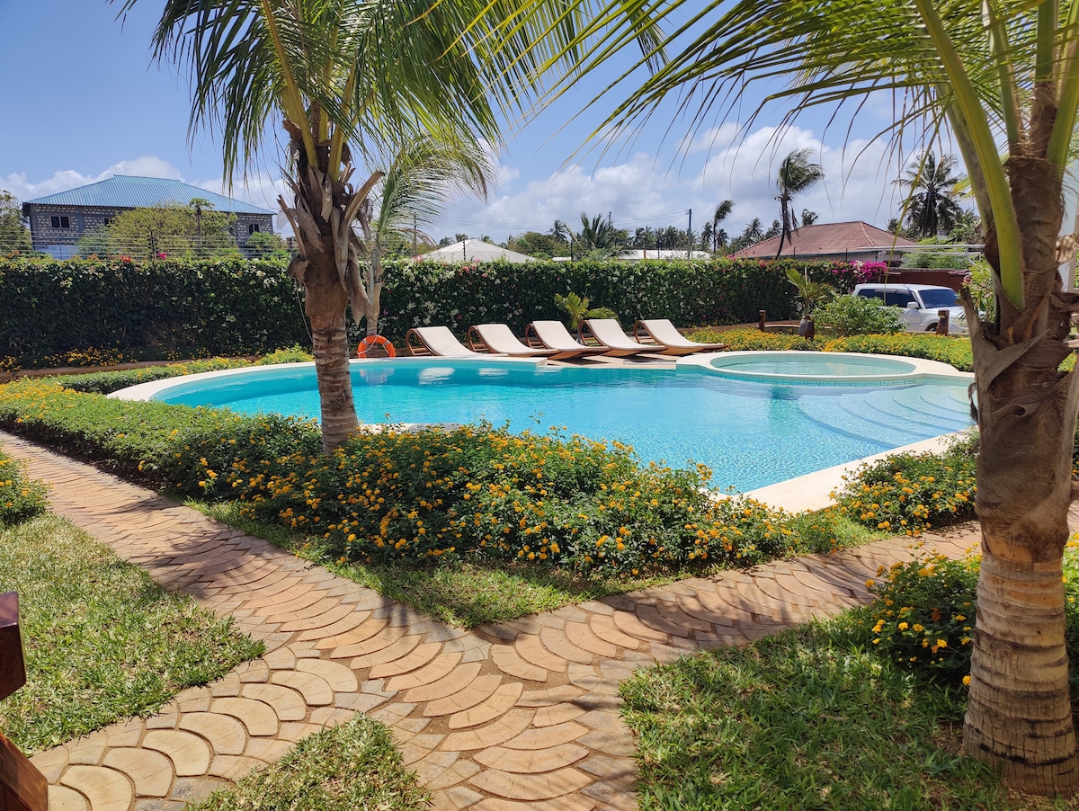 Enjoy the elegance of Kijani Paradise next to the 5 star ocean beach resort and Malindi Golf Club. This unique home away from home has a style of its own featuring the beauty of the sea shells and creatures . There is a dry lobster shell decoration that can be your own at a small fee. Enjoy the morning sunrise, seas breeze, pool, grass lawn and gazebo view from the living room as you sip your delicious hot cup of Kenyan tea. Also, take a 5 minutes walk to the beach or watch from the roof top.