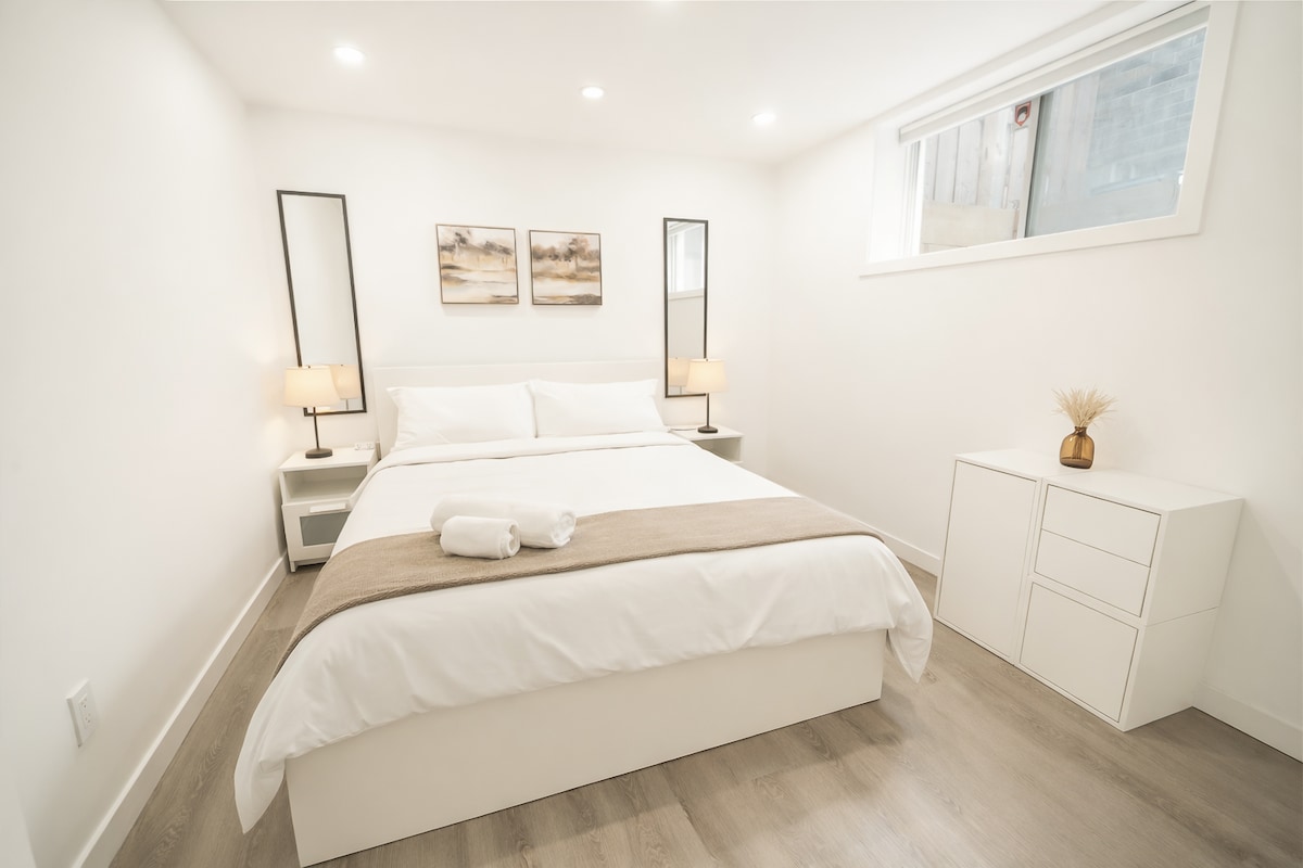 Fully furnished,, Upscale 3BR upper floor with Queen Sized Beds, parking included, glass shower, heated flooring, large 1600 sq ft layout, Fire Place, 50 inch TV; natural day light throughout, on site laundry, WIFI, white high gloss modern kitchen with quartz island, White Euro style modern decor and IKEA furniture, 9 ft ceilings , includes limited access to gym with liability waiver, as well it has a deck with barbeque also. Also new as of June 20 - NEMA and Tesla. EV charging available!!!