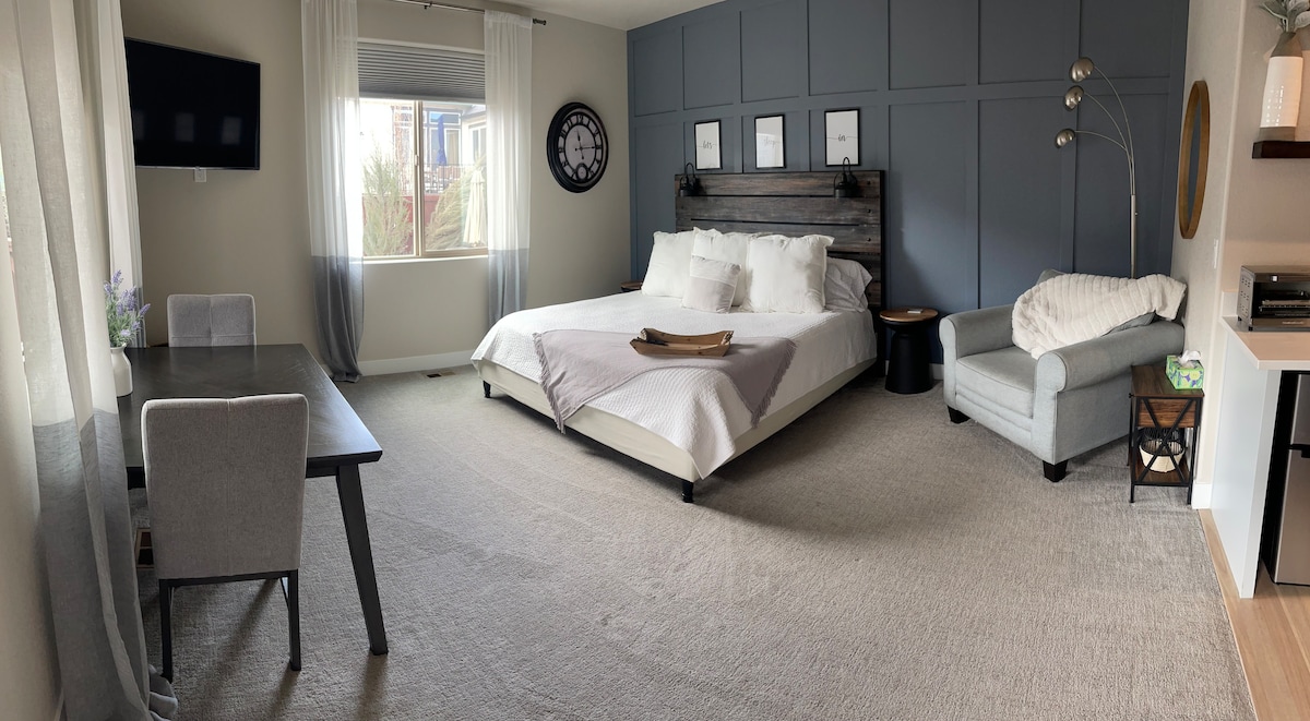 Welcome to the Lake House! This 500 sq. ft. guest suite overlooks a lake and park. This beautiful location is new, built in 2021! Through a private entrance you will find a large 15'x16' studio bedroom with a king bed, dinette, sitting area, and 60" TV. The space also includes a bunk room with a twin bunk, a luxurious bathroom, and a microwave and mini fridge. Relax and enjoy the views while staying at a centralized location in Loveland. Only 2 miles from I-25 and 1 mile from highway 34!