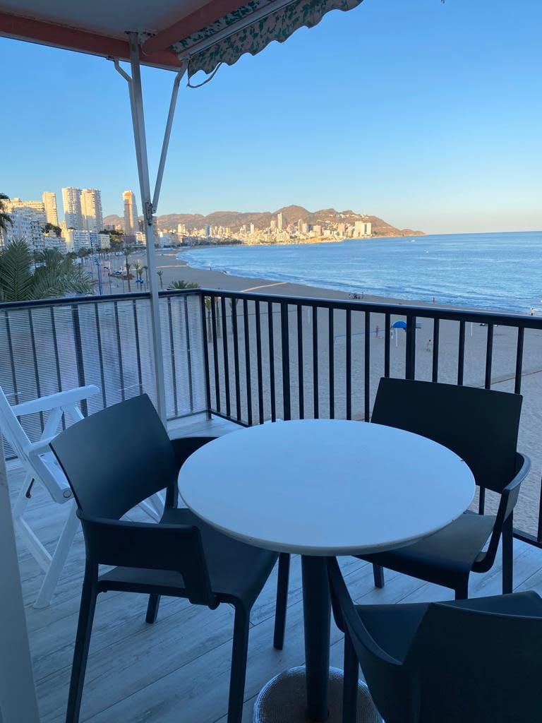 Apartamento de 2 habitaciones para 4 personas en primera línea de la playa Poniente, con vistas de la playa y el mar, terraza grande con vistas, todo exterior, salon amplio con vistas al mar, aparcamiento privado, wifi, TV, aire acondicionado, cocina completa (lavavajillas, lavadora, horno), baño completo, en urbanización con piscina, jardín muy bonito con vistas al mar y pista de tenis. La urbanización tiene acceso directo al paseo maritimo y es una de las más bonitas de la playa de Poniente.