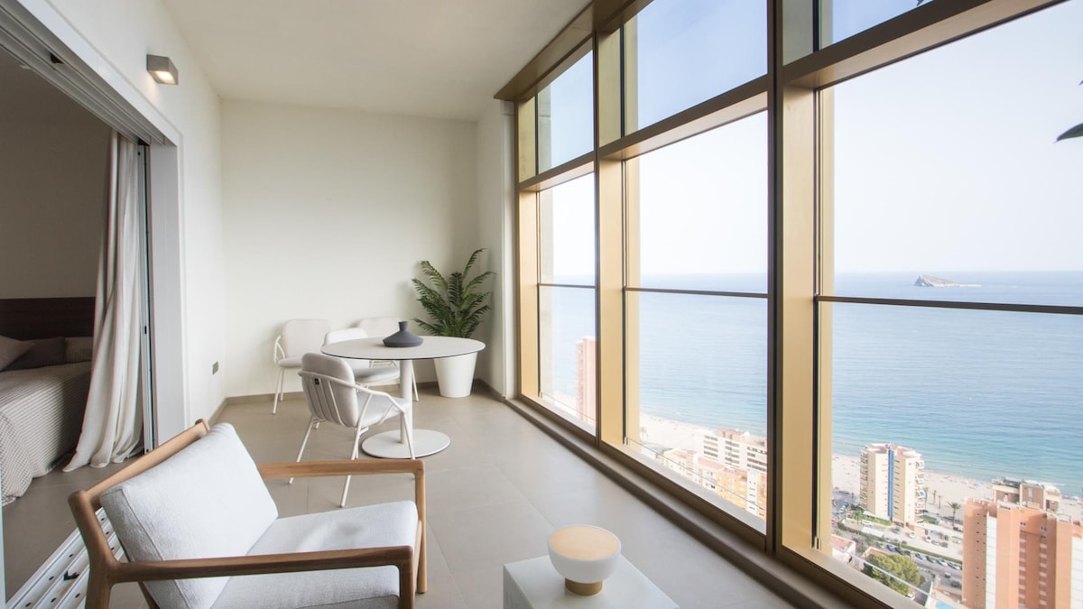 120 m² beachfront apartment, on the 21st floor corner, with open Mediterranean views from almost every room. A rare find in Benidorm for its space, location and privacy. Wake up facing the sea, enjoy breakfast with natural light and end the day with a glass of wine at sunset. Recently renovated, bright and thoughtfully designed, with adjustable LED lighting. Communal pool and private parking included.