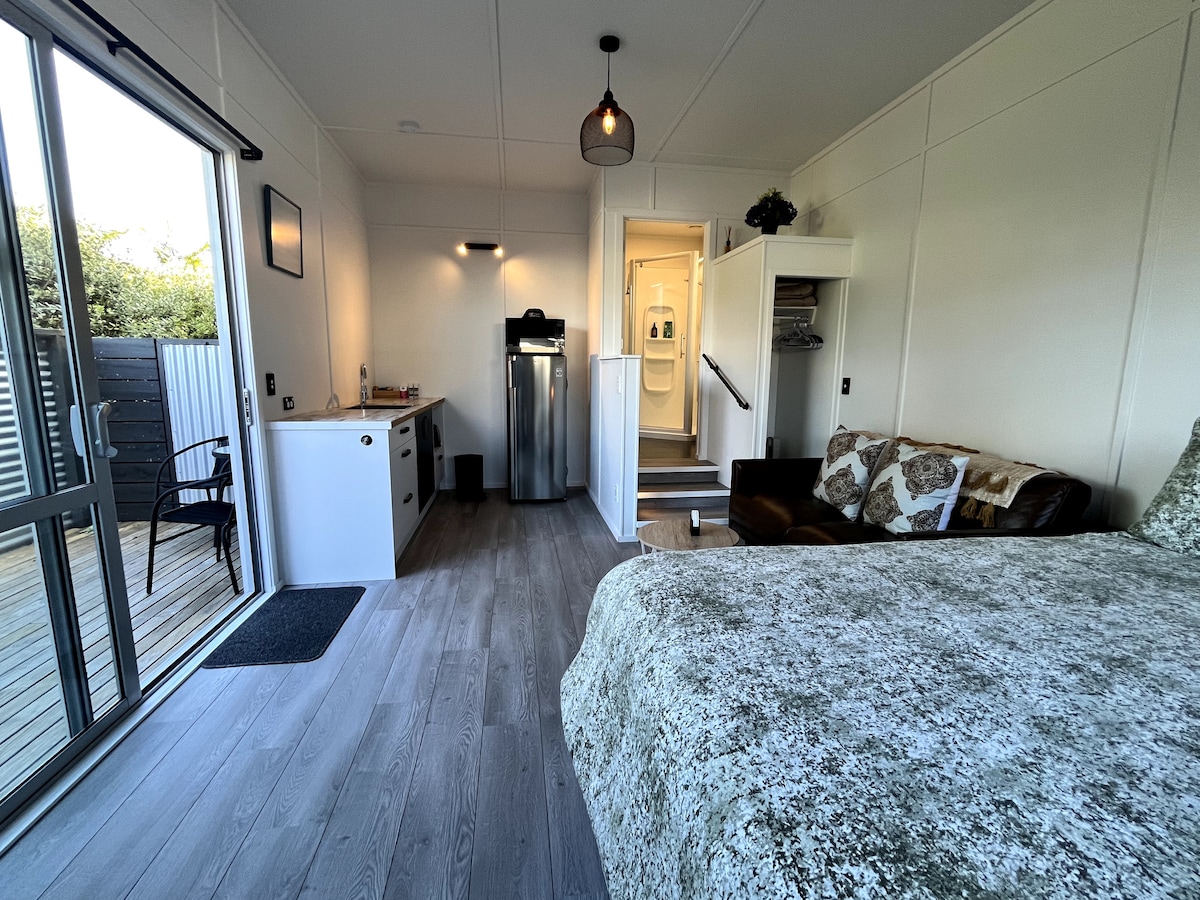 Studio loft above garage. Attached to main house. Separate entrance so you can come and go as you please. Ample storage for your belongings. Spa pool available. Private in a spa hut. With a stunning view. Newly built, spacious & sunny. Ensuite, kitchenette (basics provided, including jug, toaster, microwave & mini fridge, (multi purpose sink in bathroom only) starter breakfast, TV, off street parking, linen & towels provided. Located a 5 minute drive from town center.