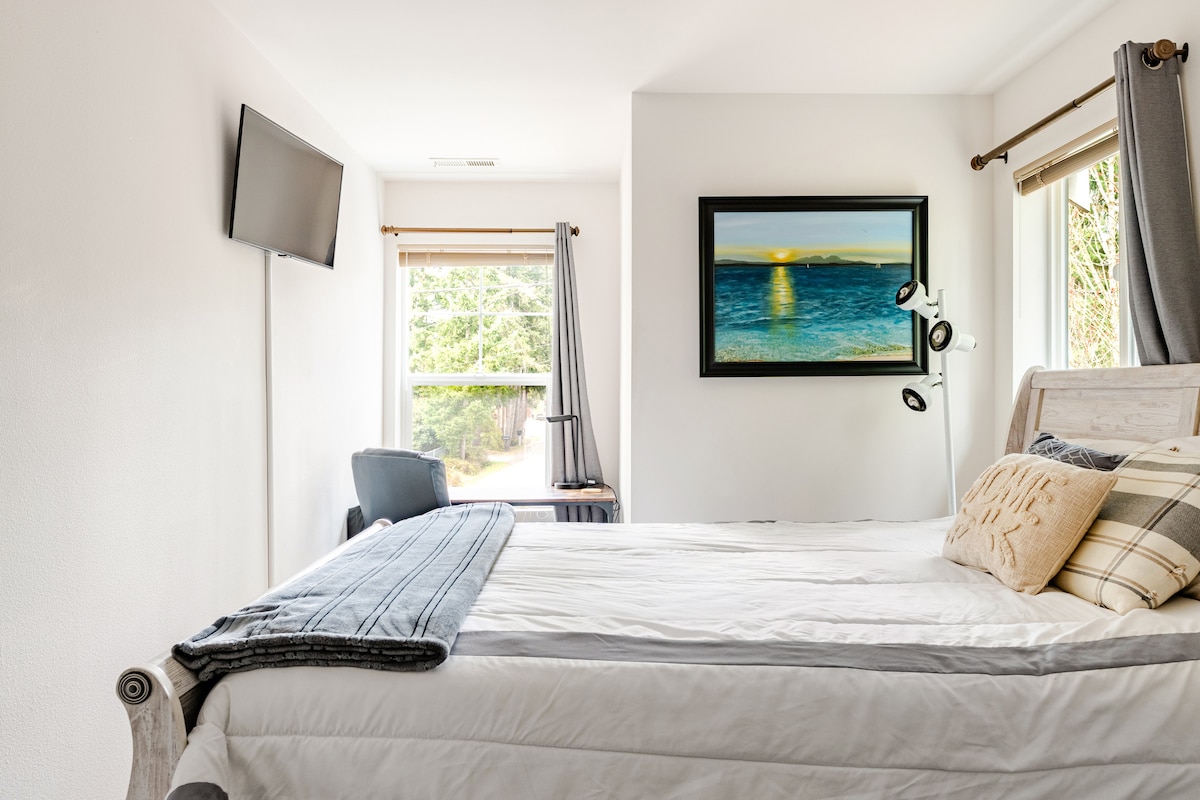 This spacious suite claims the entire 3rd floor. It has a King bed for 2, living room w/gas fireplace and French doors opening onto a Juliet balcony, overlooking Penn Cove, Mt. Baker and the historic Coupeville. The private bath has an air jetted tub and shower. Find also a smart TV streaming, and fiber WiFi. Continental breakfast is available to all guests. Due to our rooms being individually unique, prices differ base on the room and seasonal prices.