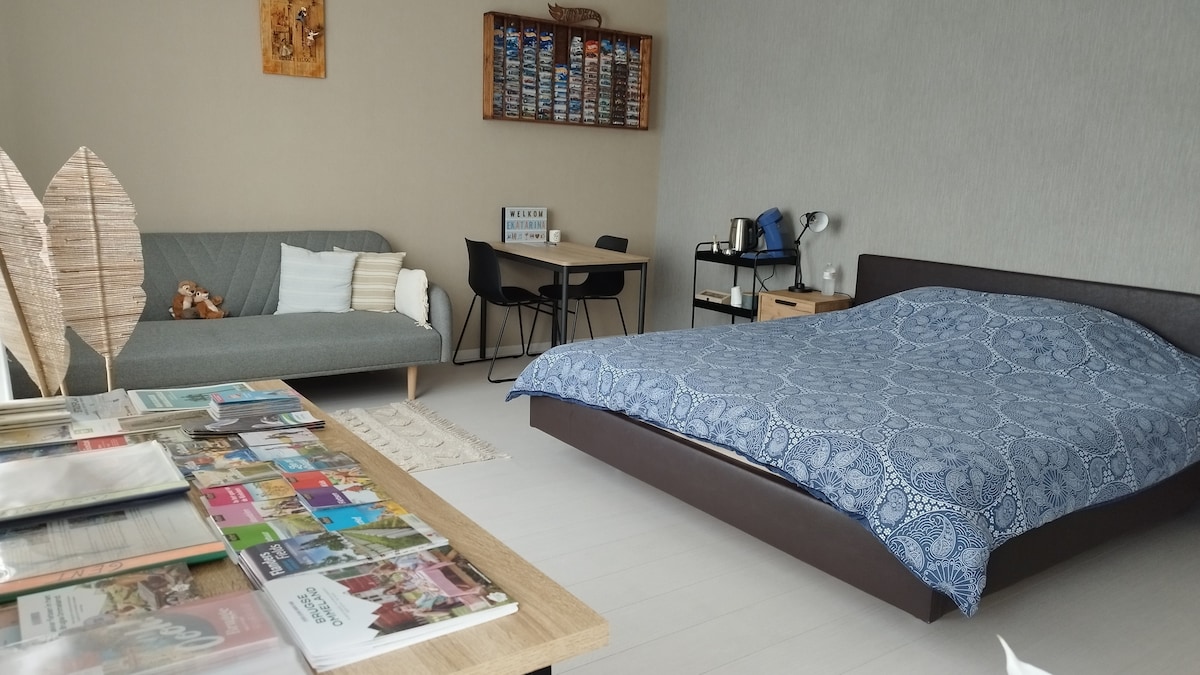 Quietly located studio on the first floor with plenty of natural light. The large terrace offers a beautiful view over the fields. Located within cycling distance of the bakery. The Groenhove forest and two restaurants are within walking distance. Visit the castles of Torhout. Ideal as a base for visiting cities like Ghent, Bruges, Kortrijk, Lille, or for a relaxing day at the seaside. Free Wi-Fi and use of the washing machine. There is a paid charging station for EV on a private parking.