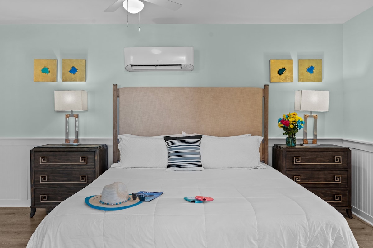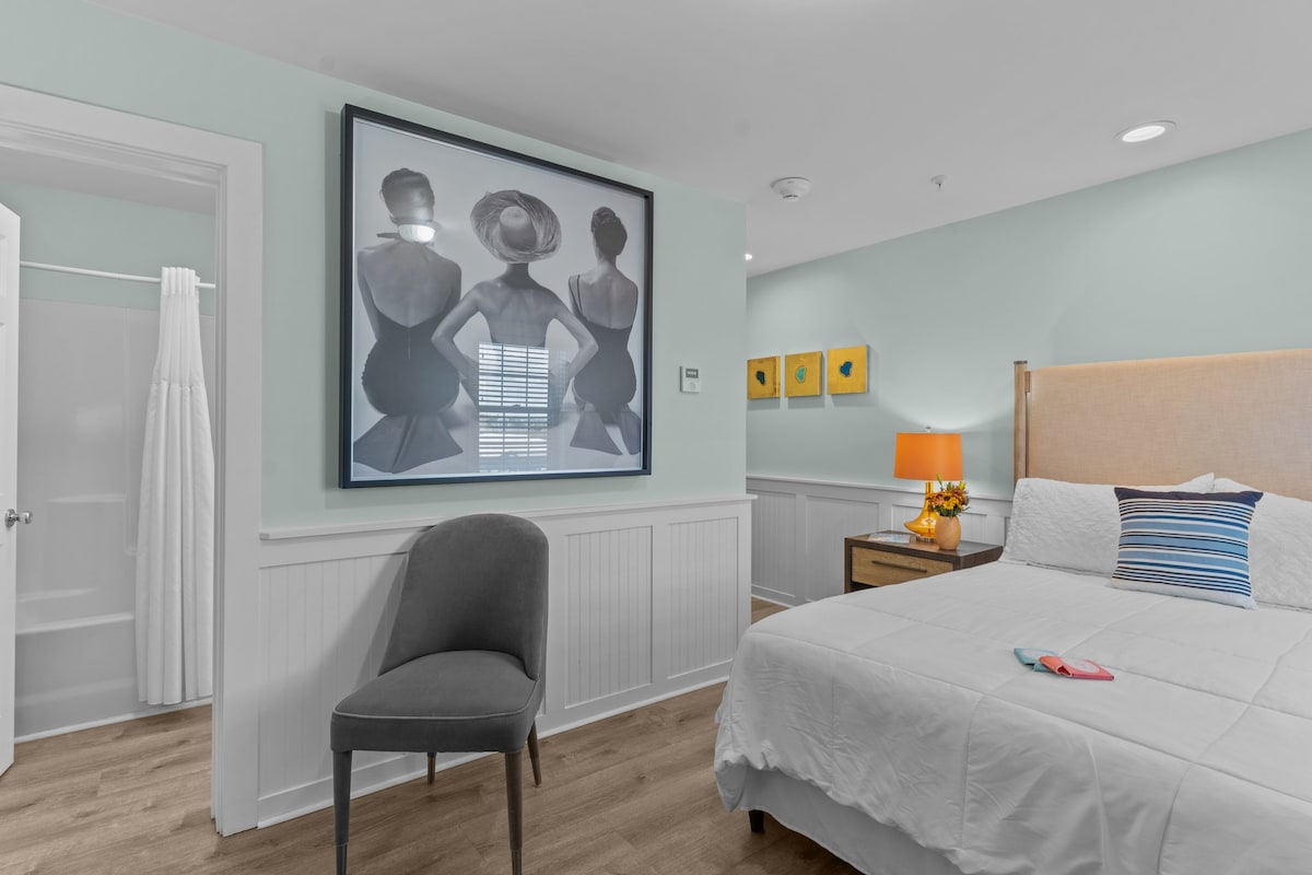 Come stay awhile at the new Starlite Inn. The Inn is newly renovated with a mid-century modern design and just steps away from the heart of Carolina Beach. Your room will accommodate up to 2 guests. Top grade linens and plush towels. This room has one king size bed as well as a mini fridge and Keurig coffee maker. This unit has a private bathroom with a stand up shower. Once you're settled, it's time to relax and unwind at the beach! *One assigned parking spot per room.