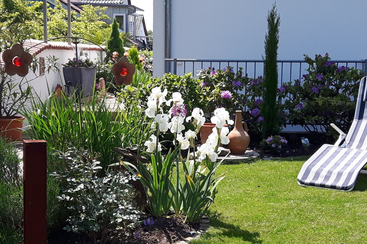 In the green surroundings near the forest with birdsong, enjoy the sun and sit outside on the wraparound balcony or downstairs on the brick terrace, parking in front of the gate, bus stop (line 35, or call taxi) to the city center diagonally opposite, 4 km to the center, 10-minute walk to the Käppele pilgrimage church with view, idyllic and centrally located, cyclists especially welcome, breakfast (available in the mini-fridge) and coffee preparation (comfortably inside or on the balcony)