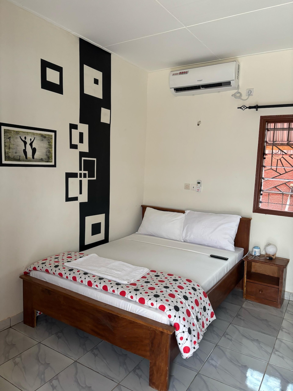 Cette chambre est parfaite pour un séjour agréable à Yamoussoukro. Équipée d’un lit queen-size, d’une climatisation, ainsi que de tout le nécessaire pour un séjour agréable. Idéale pour les voyageurs souhaitant explorer la ville ou se détendre dans un cadre tranquille, cette chambre vous offre un espace privé et confortable à quelques minutes des attractions principales de Yamoussoukro. Le petit-déjeuner est disponible sur demande pour bien commencer la journée.