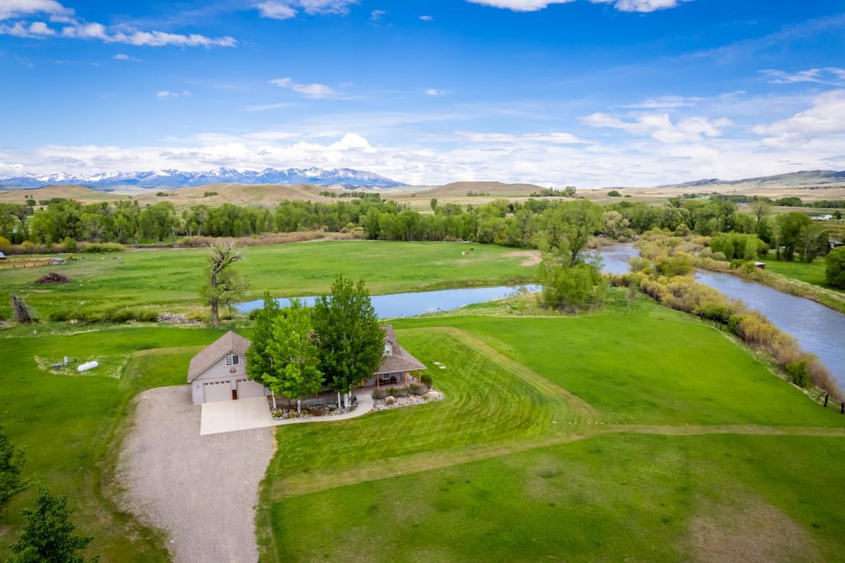 The Cabin is located on the west end of our family owned and operated cattle ranch. It has a full kitchen with everything needed to cook meals, a full bathroom, master bedroom with a queen size bed, small open loft with a pillow top double bed and 2 XL twin mattresses. The Yellowstone River is less then 100 ft from the front porch! Enjoy morning coffee watching the sun rise on the Crazy mountains, and in the evening sit on the front porch and relax & enjoy the beautiful sunset behind the mtns.