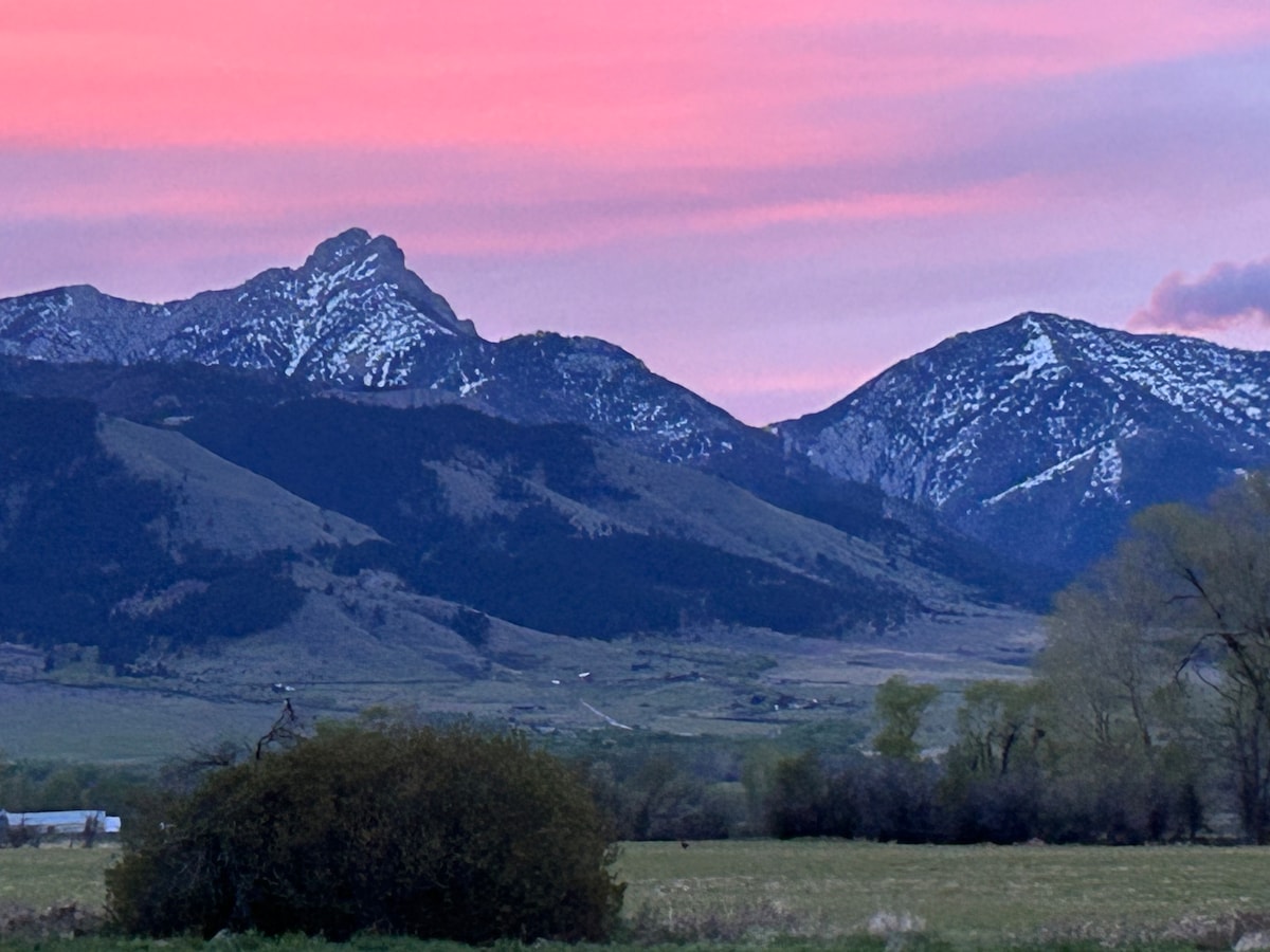 Private driveway parking, Good sized room with tiled bath, private entrance w/porch & beautiful views. 5 minutes to Yellowstone River, walking trails, & Downtown Livingston. Fridge/freezer, microwave, coffee maker, small dining area. Roku Smart TV & wifi. Paid access to our personal Jacuzzi infrared Sauna or a Zen Himalayan Sound Bowl Therapy session. Request at booking. Tyent Alkaline Water by request. 45 min to Bridger Bowl Ski Area & Streamline bus service. 1 hr 40 min to Big Sky Resort.