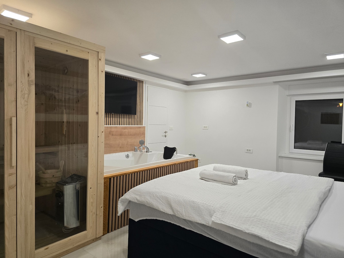 Doživite vrhunsku udobnost i opuštanje u modernom Penthouse apartmanu. Ovaj ekskluzivni apartman nudi dvije elegantno uređene spavaće sobe i dvije kupaonice, pružajući udobnost i privatnost. Glavna atrakcija vašeg boravka bit će privatni grijani bazen, gdje možete uživati u suncu. Uz to, opustite se u hidromasažnoj kadi ili uživajte u sauni za potpuni spa doživljaj. Apartman se odlikuje modernim dizajnom s visokokvalitetnim završnim obradama. Ovaj Penthouse pruža nezaboravno iskustvo.