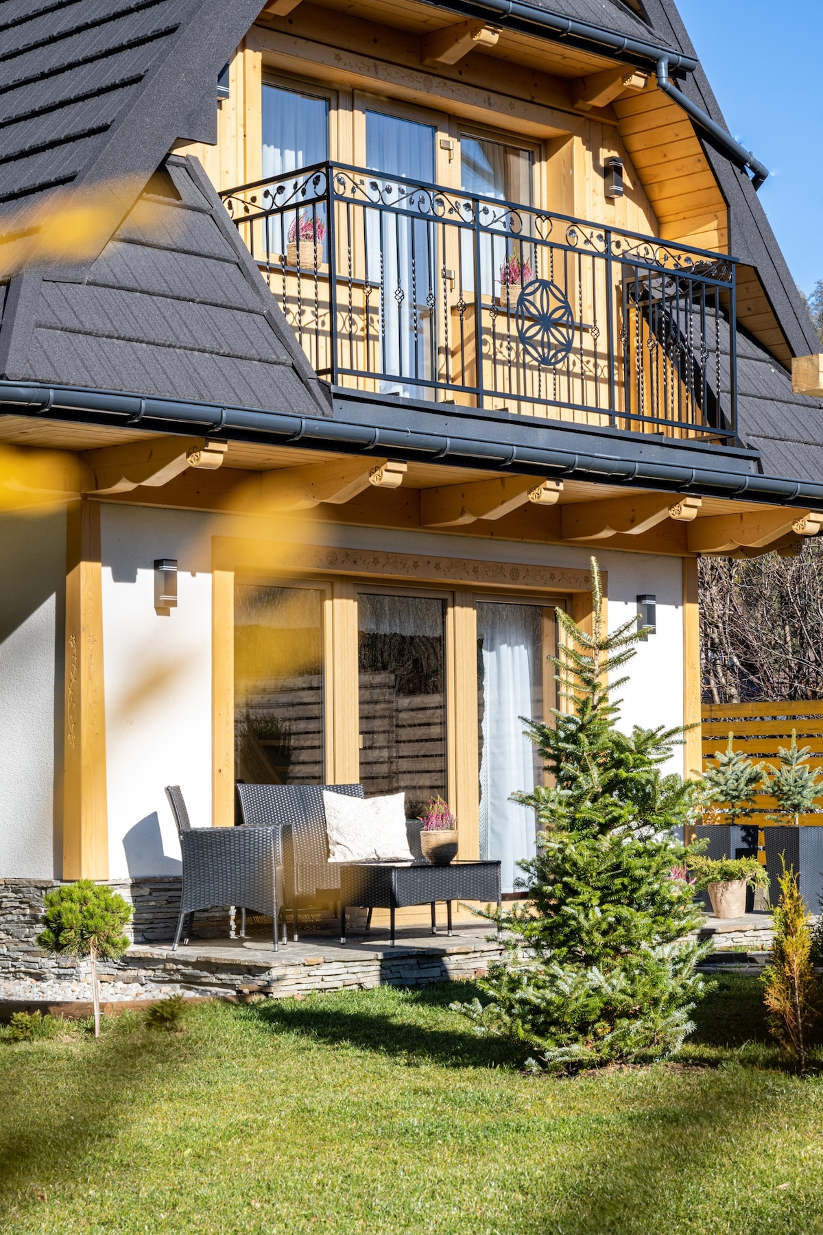 Let's start with the general idea. The buildings, topped with sloping roofs, seem to float in the air above the slope. The houses we offer to our guests were built from local slate rocks and wood obtained from old shepherds' sheds. This is our nod to local tradition, because in this place once stood such simple, farm sheds, or in highlander style - sopa.
