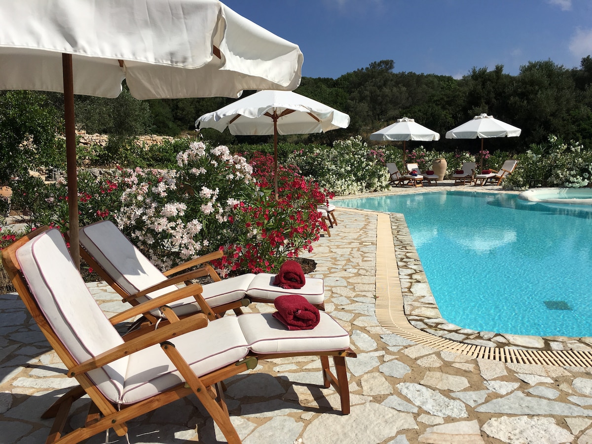 Our apart hotel is set in unspoiled nature with olive groves. You’ll love your apartment suite because of the luxury we provide, our colourful garden, the stunning views over the island and Ionian Sea as well the Milky way, your served breakfast on your private terrace (July and August) Each suite has a private terrace around the swimming pool. Every of our 4 suites have a kitchenette one a outside kitchen. We have on only 5 to 10 minutes drive 14 restaurants and many beaches to discover
