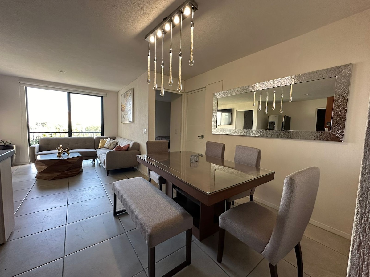 El departamento cuenta con aire acondicionado en RECÁMARA PRINCIPAL. El servicio se contrata por separado. Costo adicional de $99.00 pesos por día. Relájate en este espacio tan tranquilo y elegante. Totalmente nuevo con dos habitaciones. Espacioso para 4 huéspedes. Con opción para un 5to [con costo extra]. Con amenidades [gimnasio, ludoteca, espacio de trabajo, cine]. Excelente ubicación. En el sur de la ciudad. A 5 minutos de la plazas y supermercados. Haremos que tu estancia sea placentera.