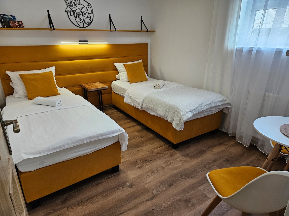 Apartmán je zložený z moderne zariadenej kuchyne, ktorá poskytuje komfort, pohodlie a príjemné posedenie pri veľkom stole, v obývacej izbe môžte relaxovať pri spoločenských hrách alebo príjemnom posedení s priateľmi, v spálni si oddýchnete v tichu, nikým a ničím nerušení.
