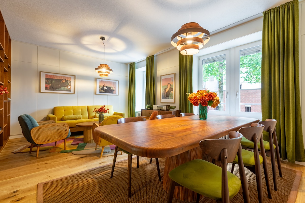 Willkommen in der Retro Suite – inspiriert vom Stil der 60er und 70er! Freu dich auf bunte Farben, auffällige Muster und dunkle Holzpaneele. Die Wohnung bietet drei gemütliche King-Size-Betten, einen großen Esstisch, eine voll ausgestattete Küche, WLAN, Flachbild-TV und Self-Check-in per Code. Ein einzigartiges Design-Erlebnis für alle, die das Besondere suchen!